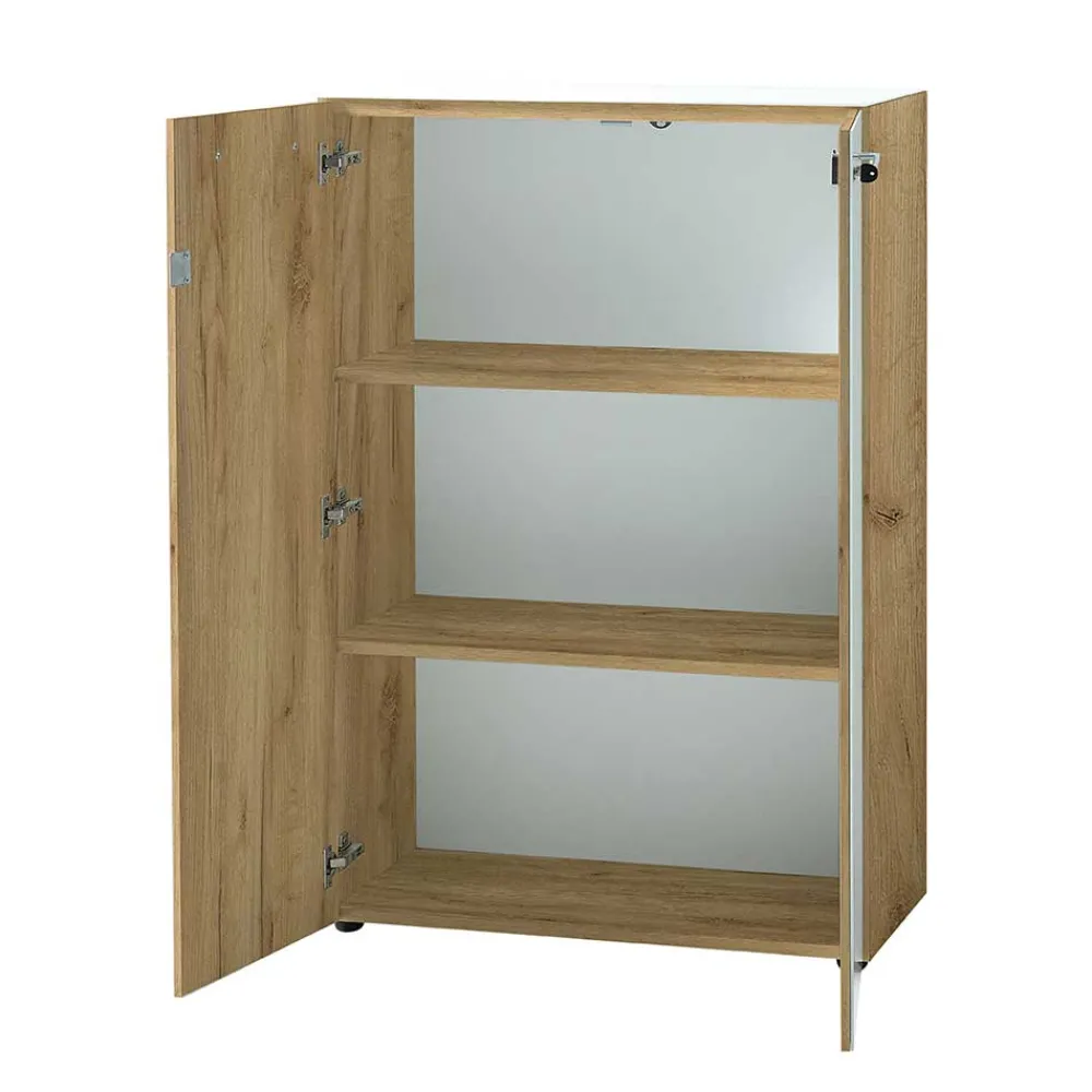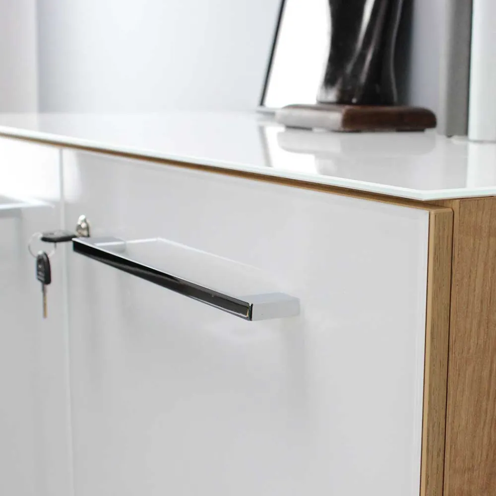 - Melaminbeschichtete Oberfläche in Weiß und in Holzoptik Wildeiche, Türen und Oberplatten zusätzlich mit Sicherheitsglas beschichtet