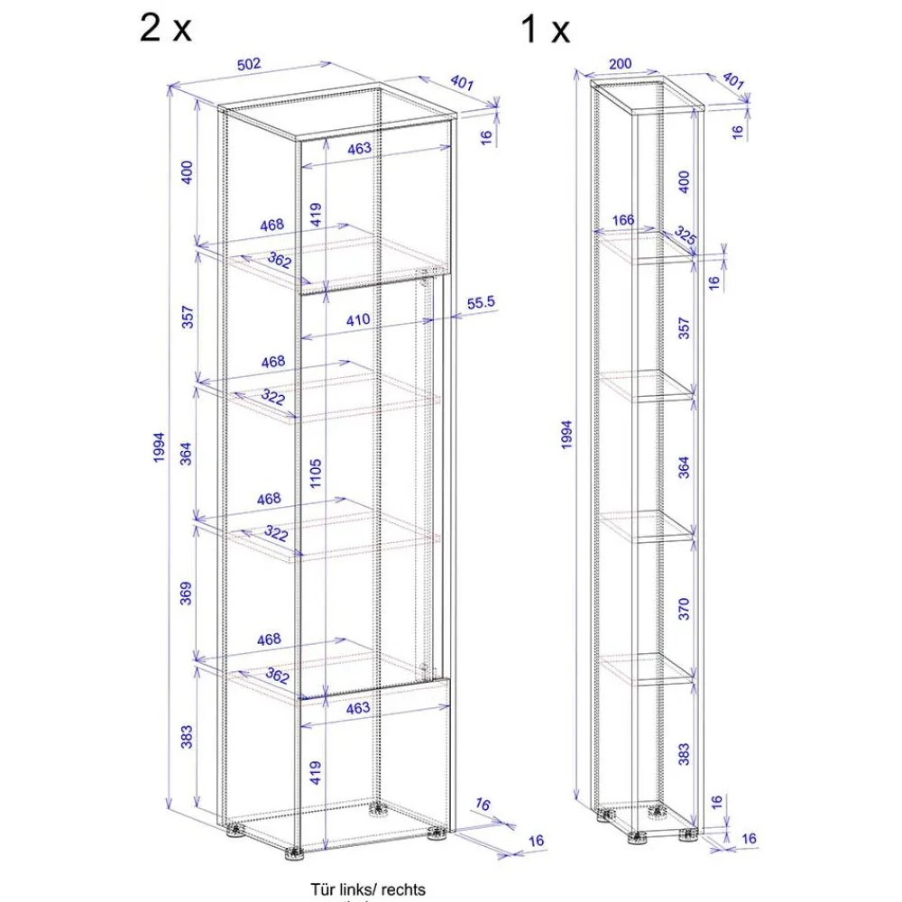 - Fünf Fächer in Ordnerhöhe, Innenmaße (BxHxT): ca. 46,8x40x36,2 cm, 46,8×35,7×32,2 cm, 46,8×36,4×32,2 cm, 46,8×36,9×36,2 cm, 46,8×38,3×36,2 cm