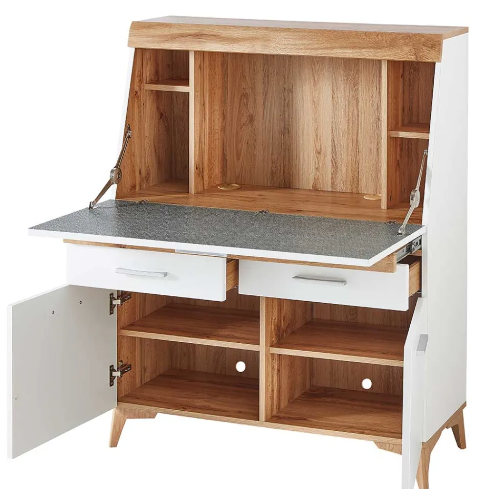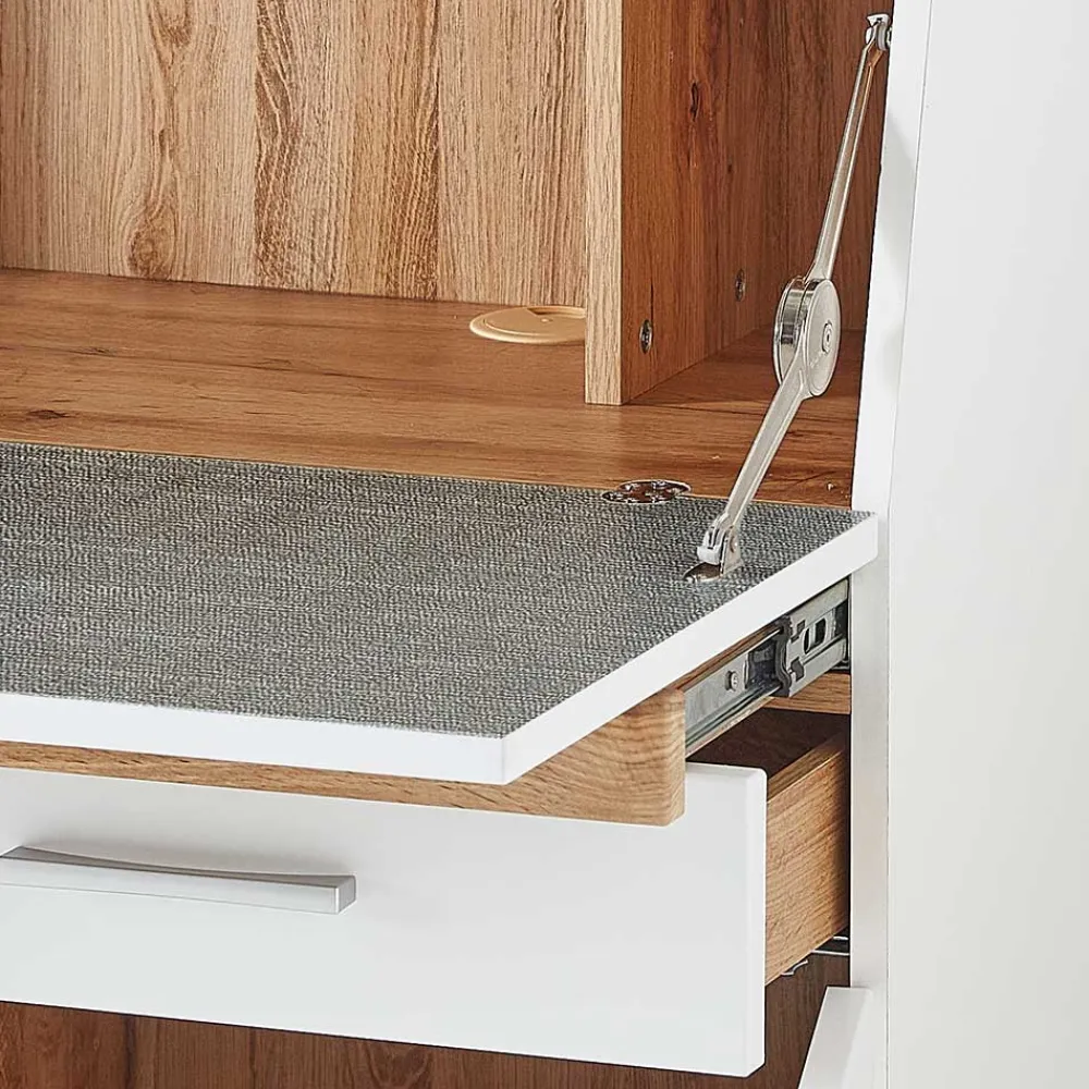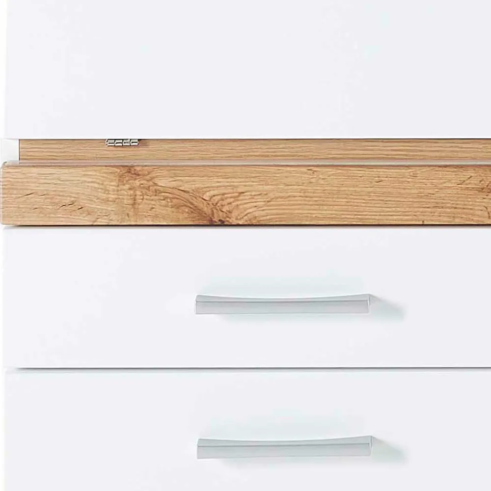 - Oberflächen weiß matt und in Holzoptik Alteiche foliert, Kanten an der Front tiefgezogen