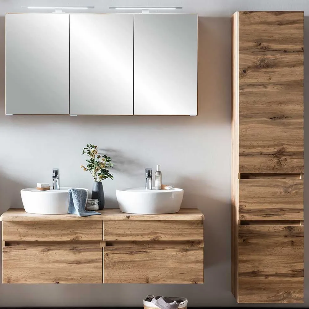 - Holzoptik Wildeiche: Korpus melaminbeschichtet, Front tiefgezogen foliert, fühlbare Struktur
