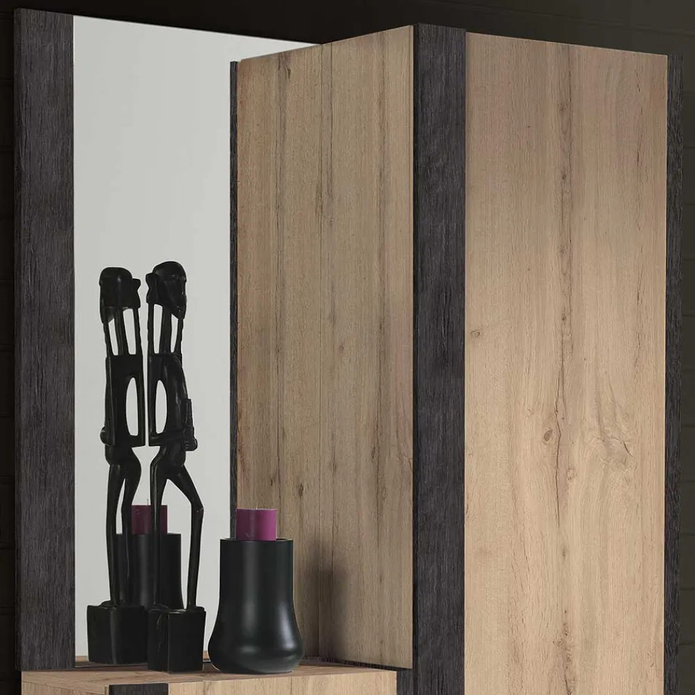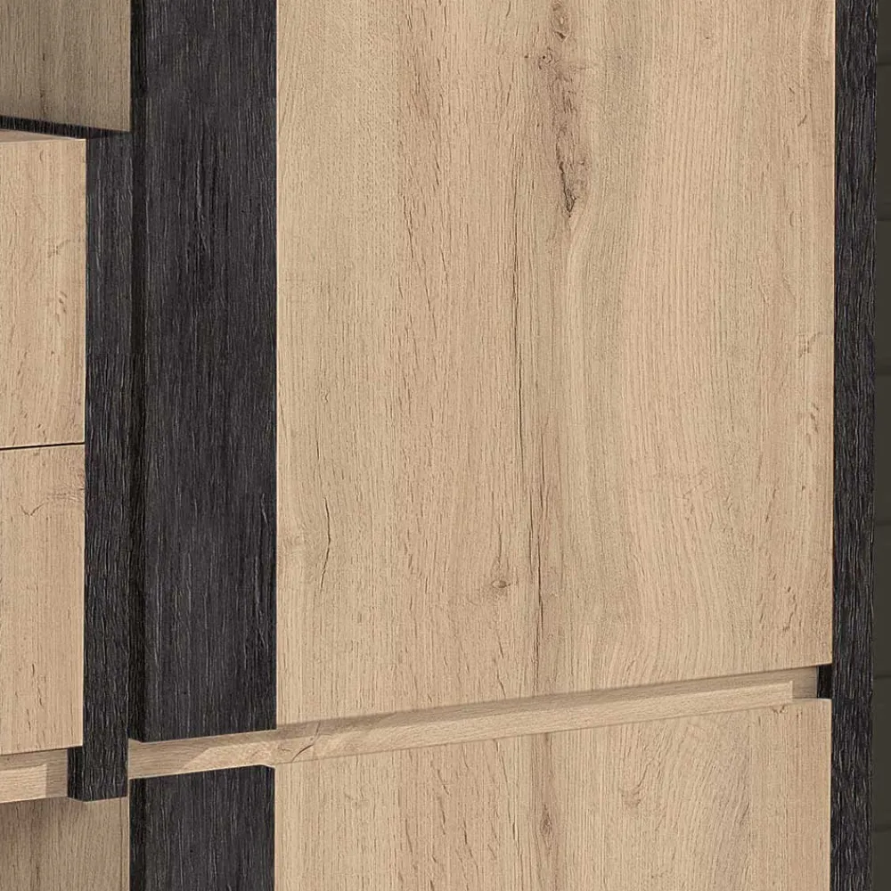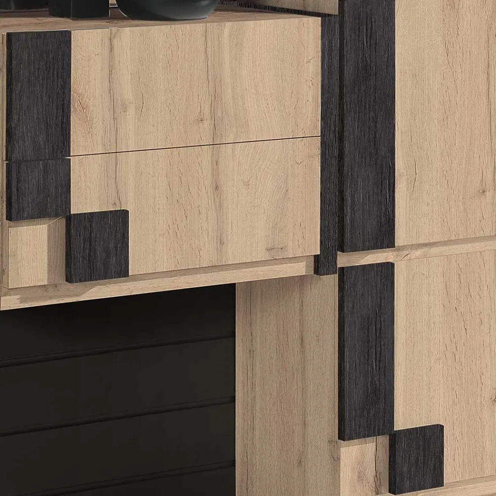 - Melaminbeschichtete Oberfläche in wildeichefarbiger und schwarzgrauer Holzoptik