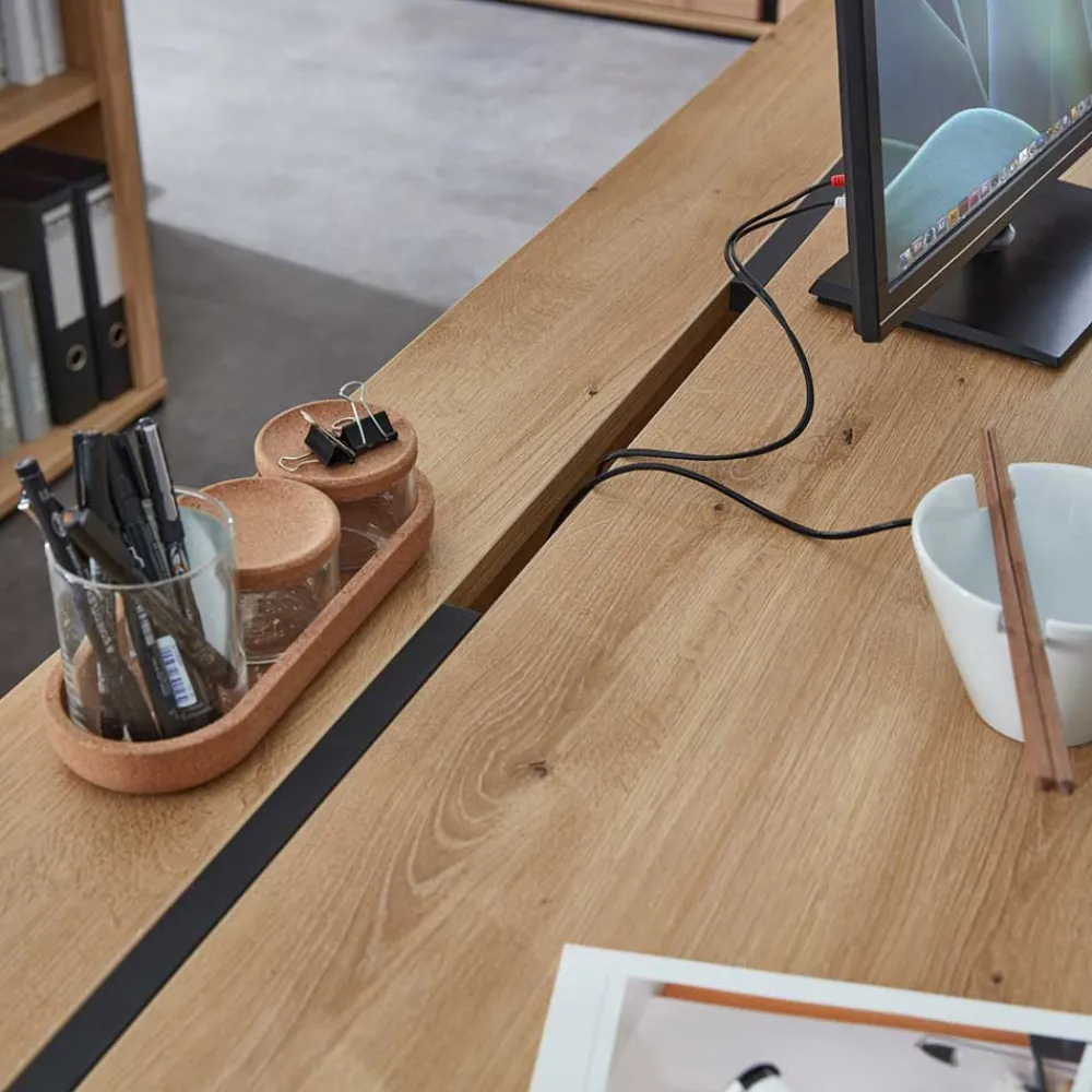 - Dieser moderne Eck-Schreibtisch in Wildeichefarben und Schwarz ist ein echter Hingucker