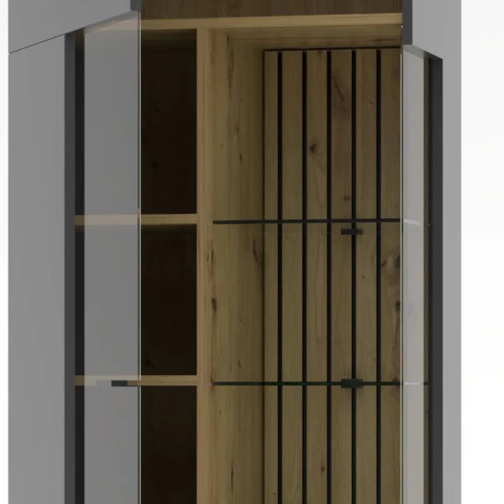- Besteht aus einem Lowboard, einer Vitrine, zwei Regalböden und zwei Paneelen
