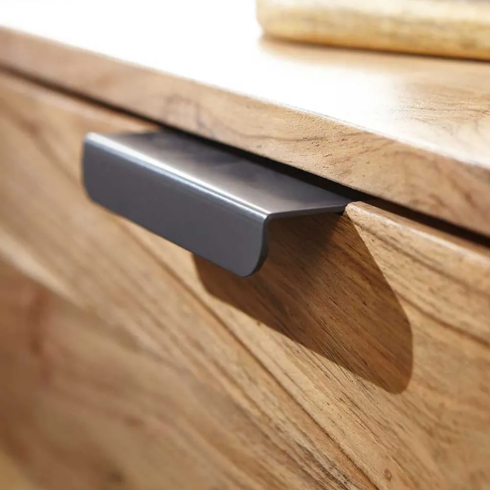 - Lackierte Holzoberfläche, besonders lebhafte Maserung, Metall in Dunkelgrau lackiert