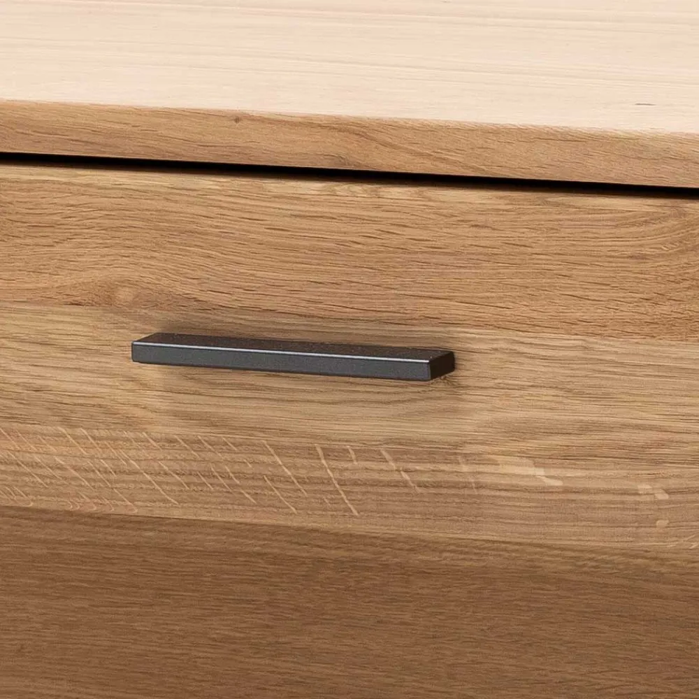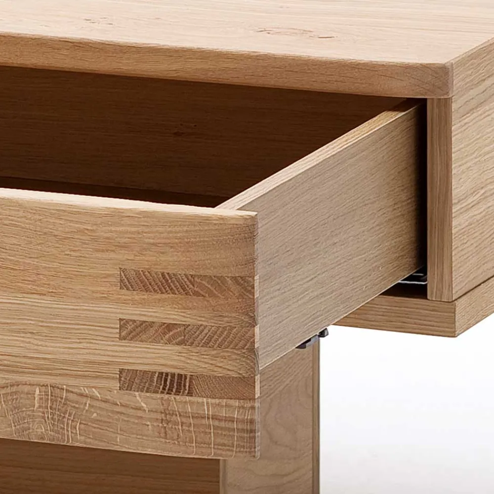 - Eine Schublade auf Metall-Unterflurführung, Innenmaße: BxHxT: ca. 107x9x44 cm, Front und Blende aus massiver Balkeneiche