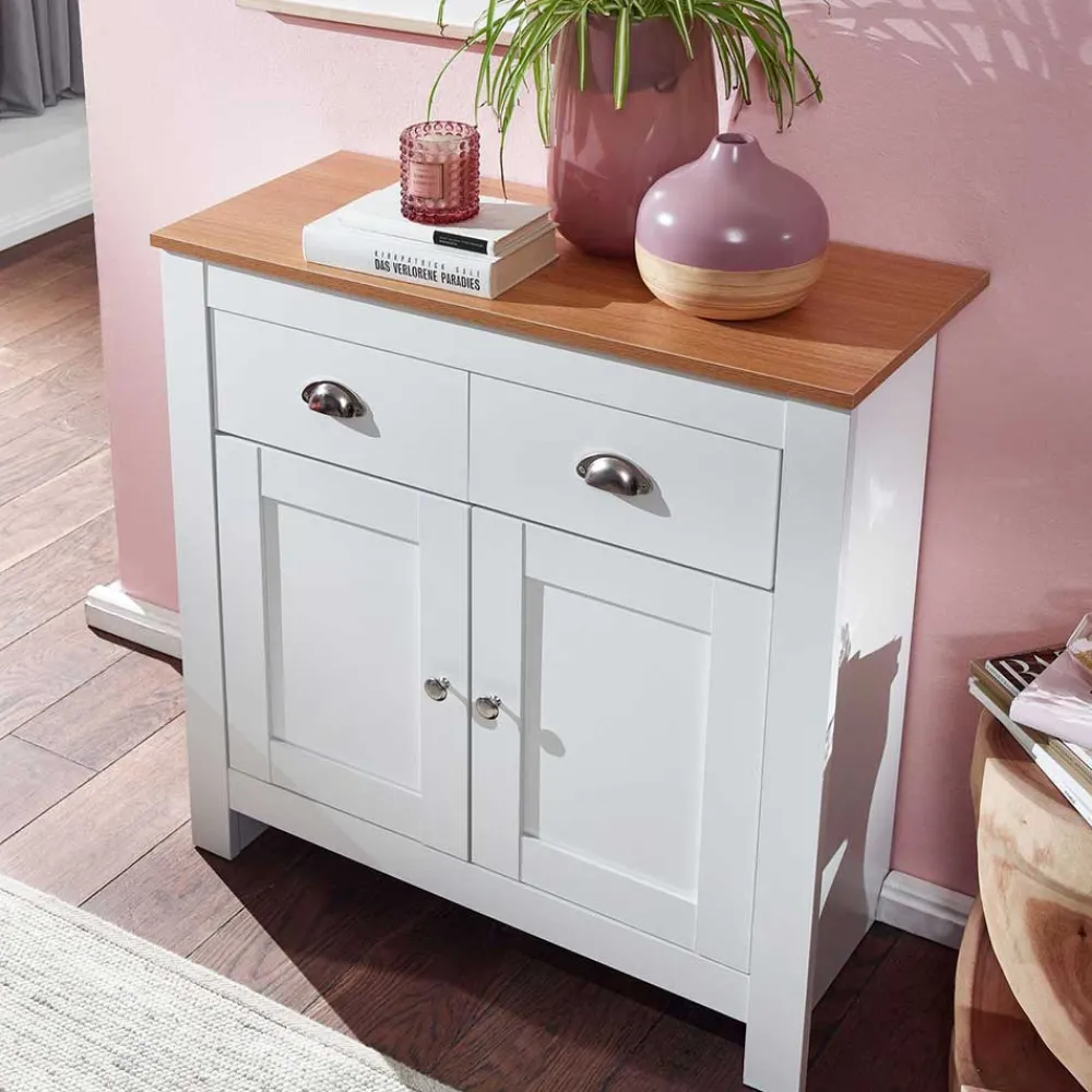 - Pflegeleicht beschichtete Oberflächen in Weiß, Absetzung in Holzoptik Eiche