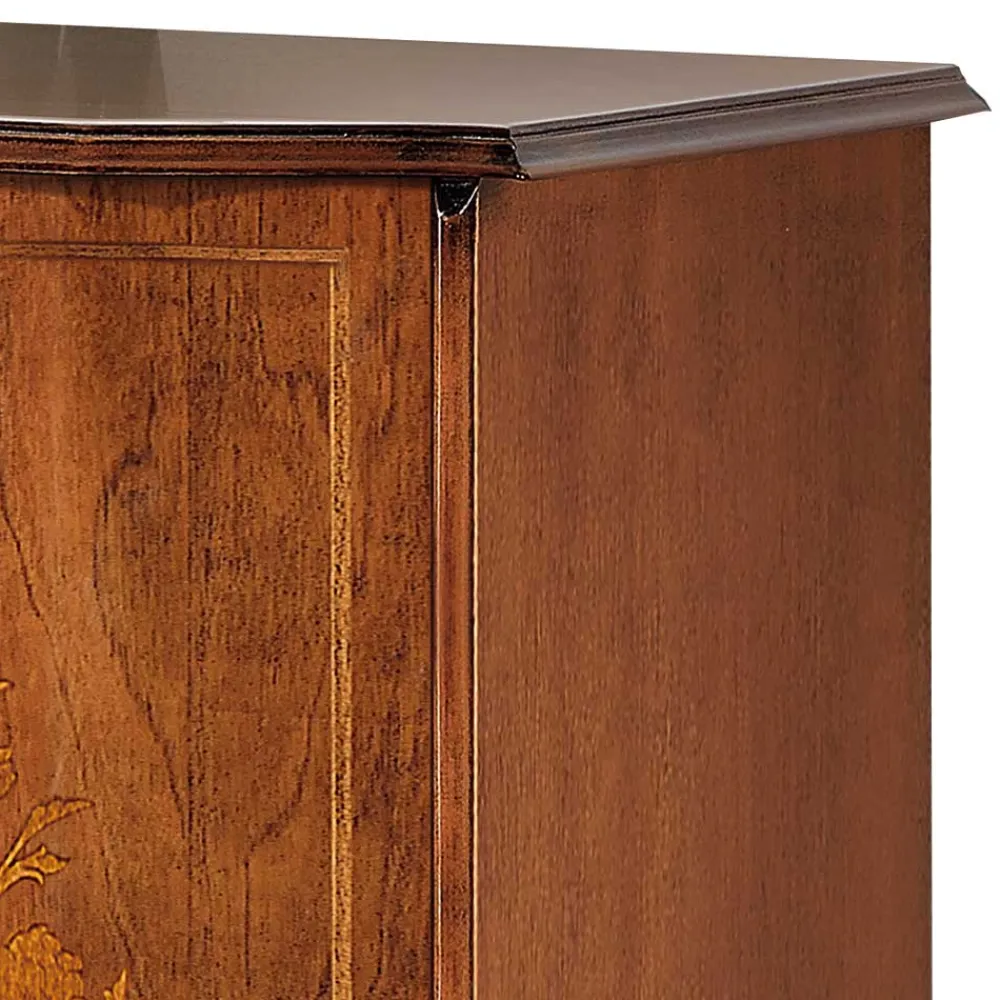 - Holzoberfläche lackiert, MDF mit Nussbaumholz furniert, Intarsien aus Pappelholz, gesamt lackiert