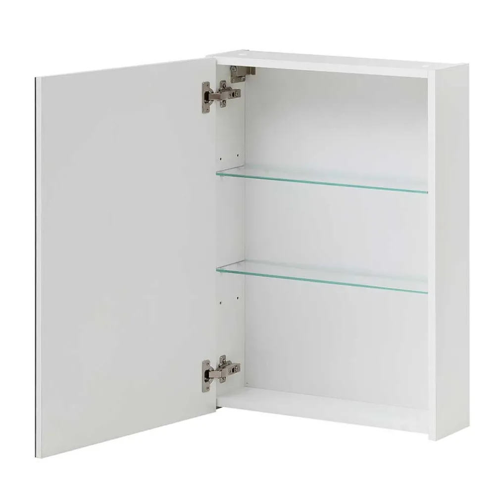 - Spiegelschrank zur Wandmontage, Rest steht auf stabilen, ca. 5 cm hohen Kunststofffüßen, eine zusätzliche Kippsicherung ist erforderlich