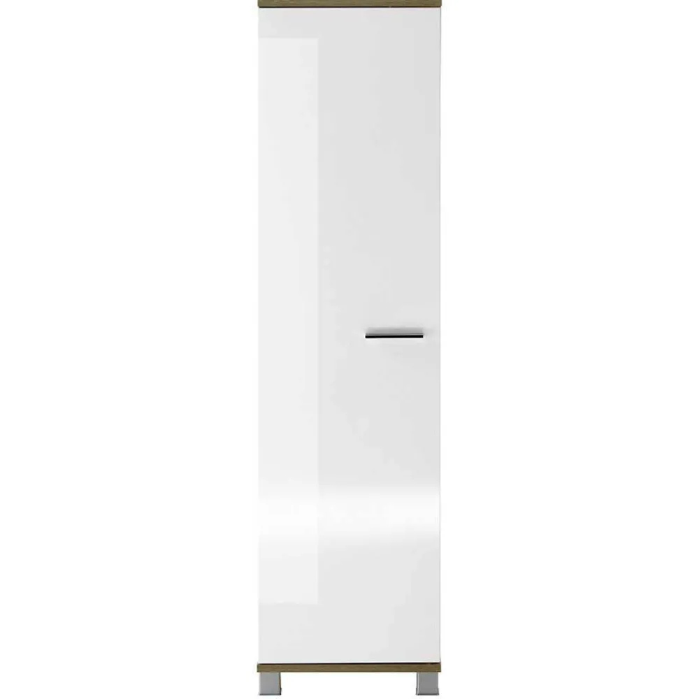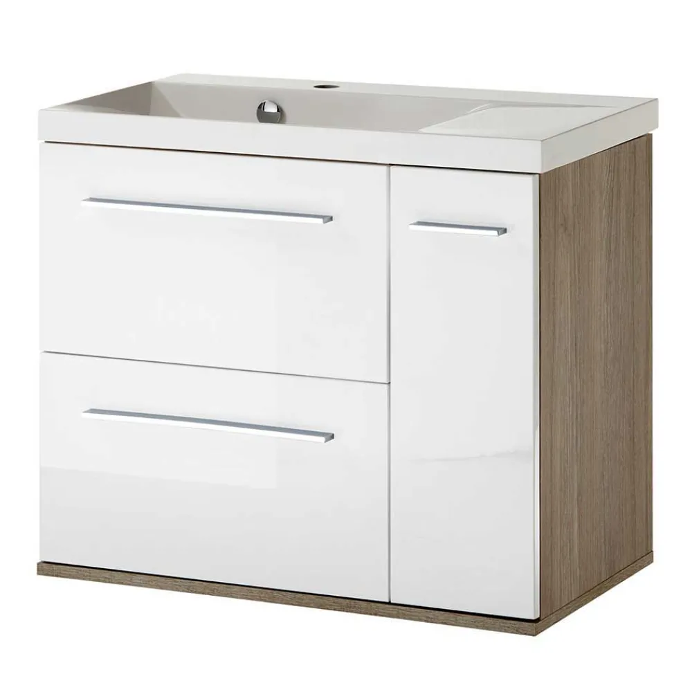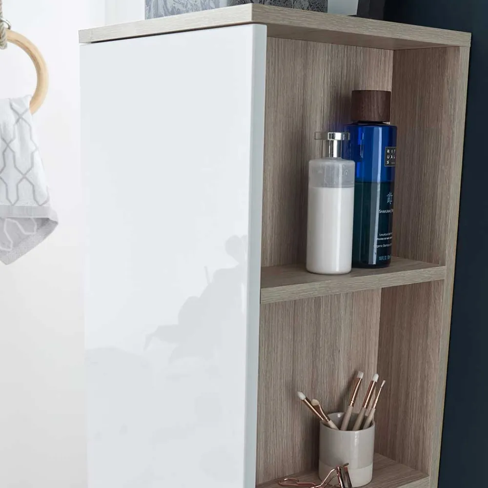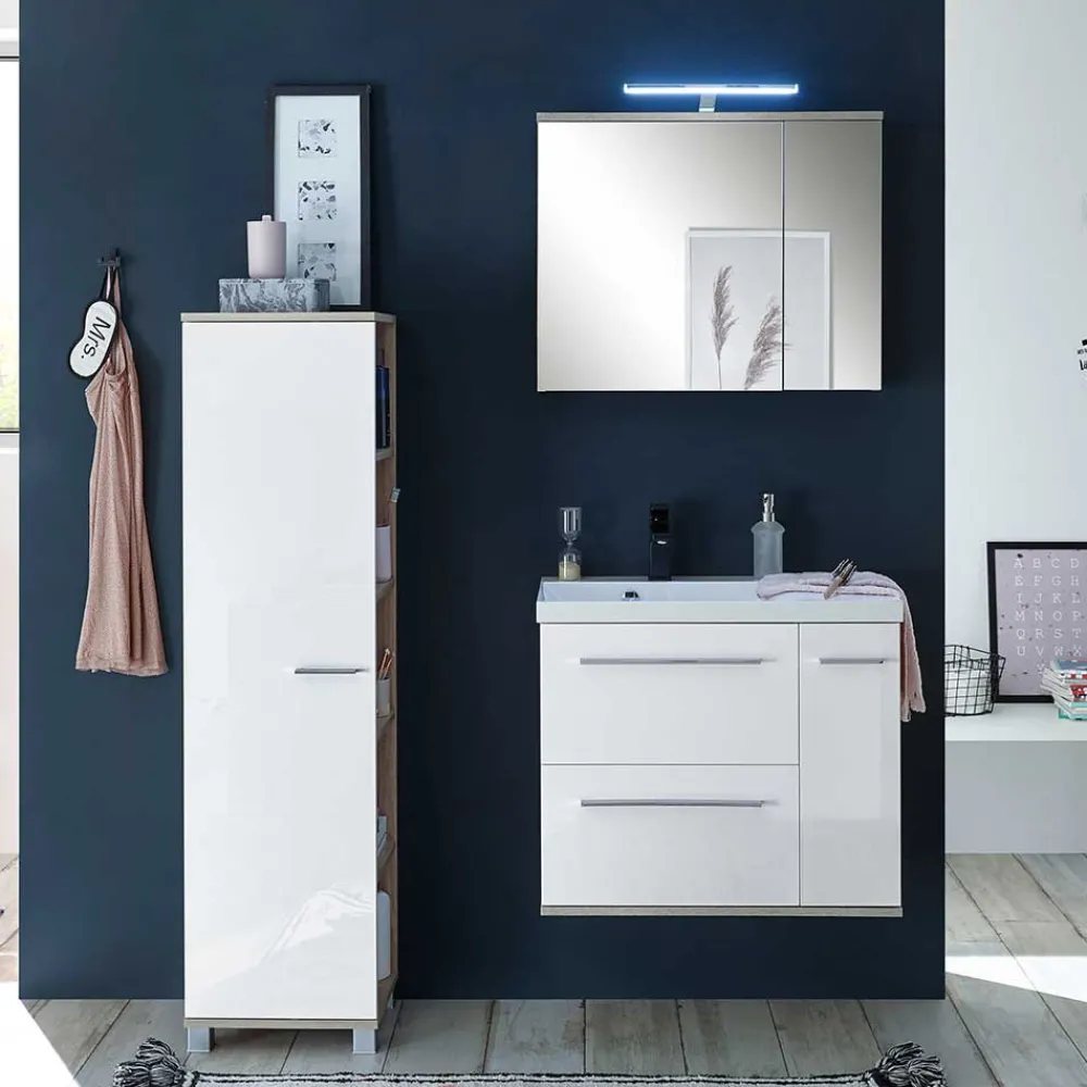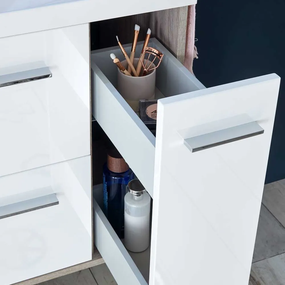 - Harmonische Badmöbel in Weiß und Eichefarben