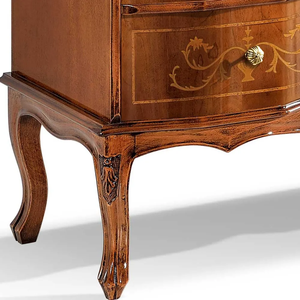 - Holzoberfläche lackiert, MDF mit Nussbaumholz furniert, Intarsien aus Pappelholz, gesamt lackiert