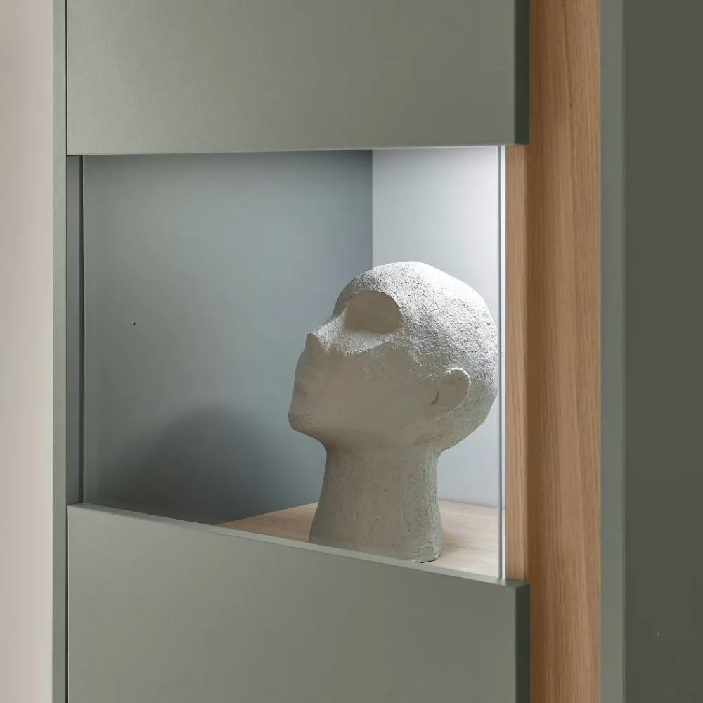 - Trendige Vitrine in Graugrün und Eichefarben