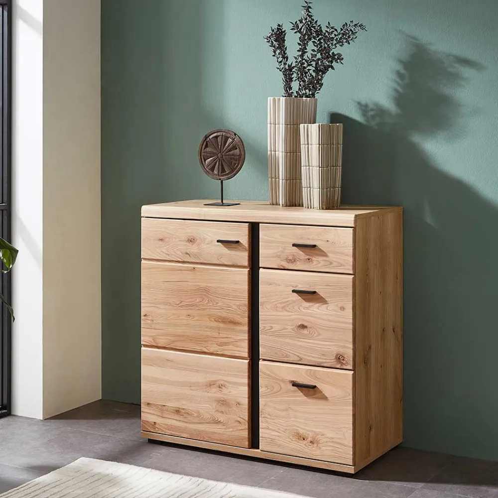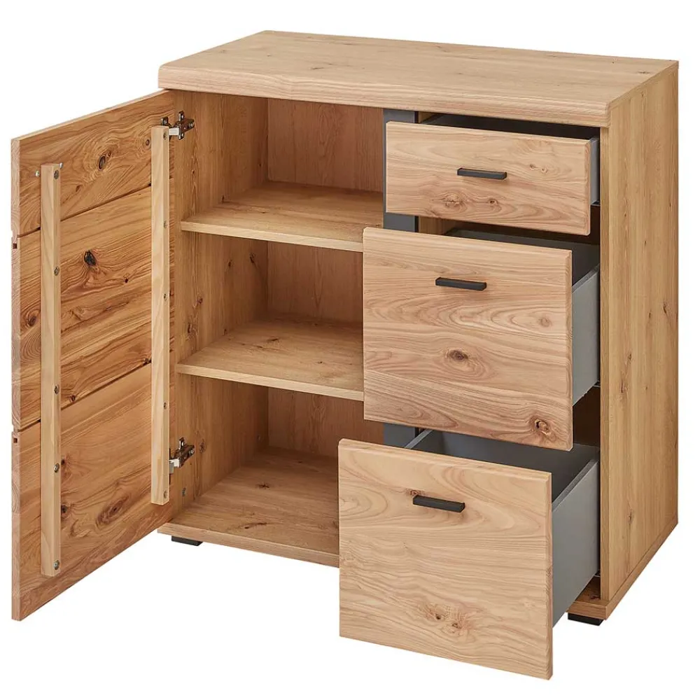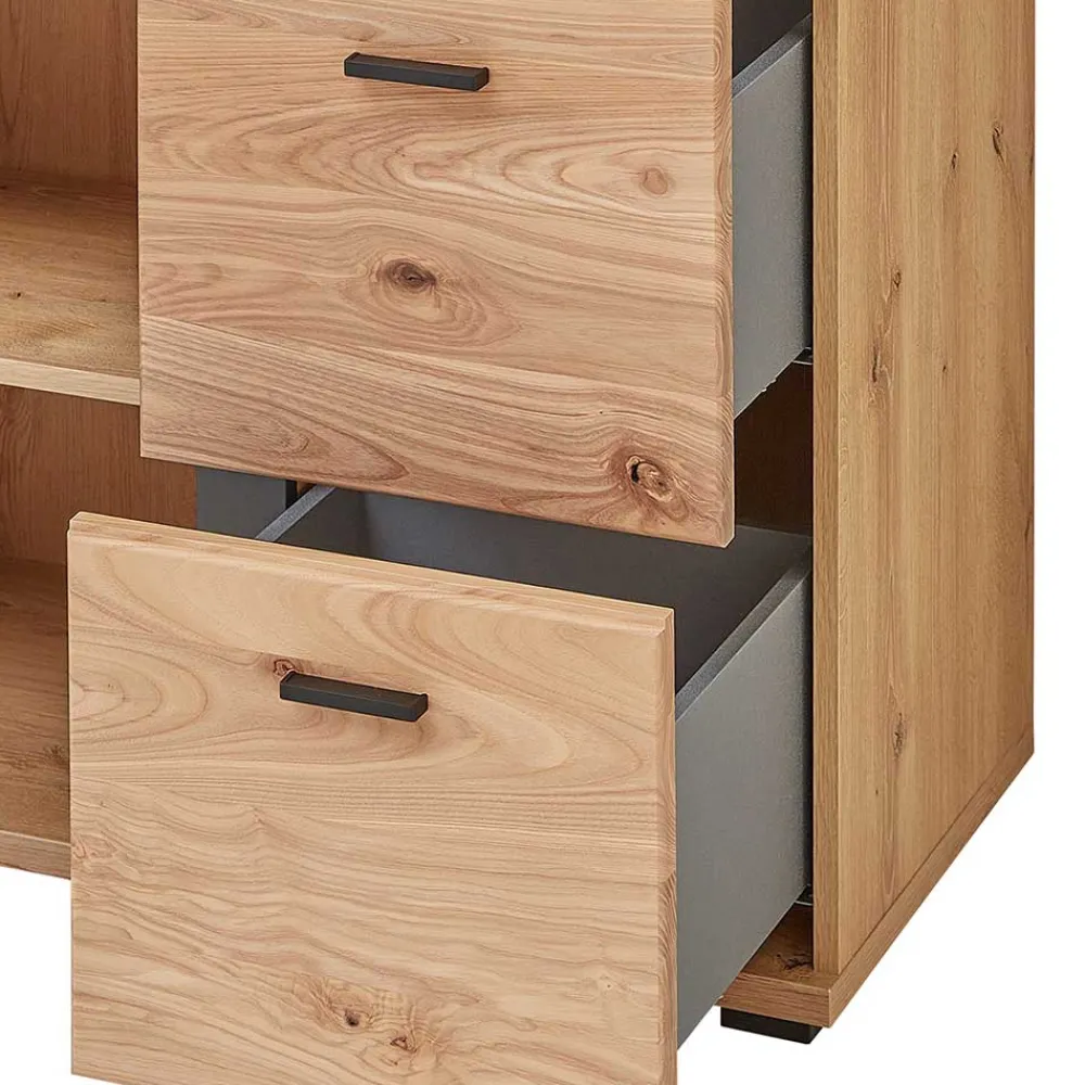 - Modern präsentiert sich dieses Möbelstück in Eschefarben (Front) und Wildeichefarben (Korpus) sowie Schwarz