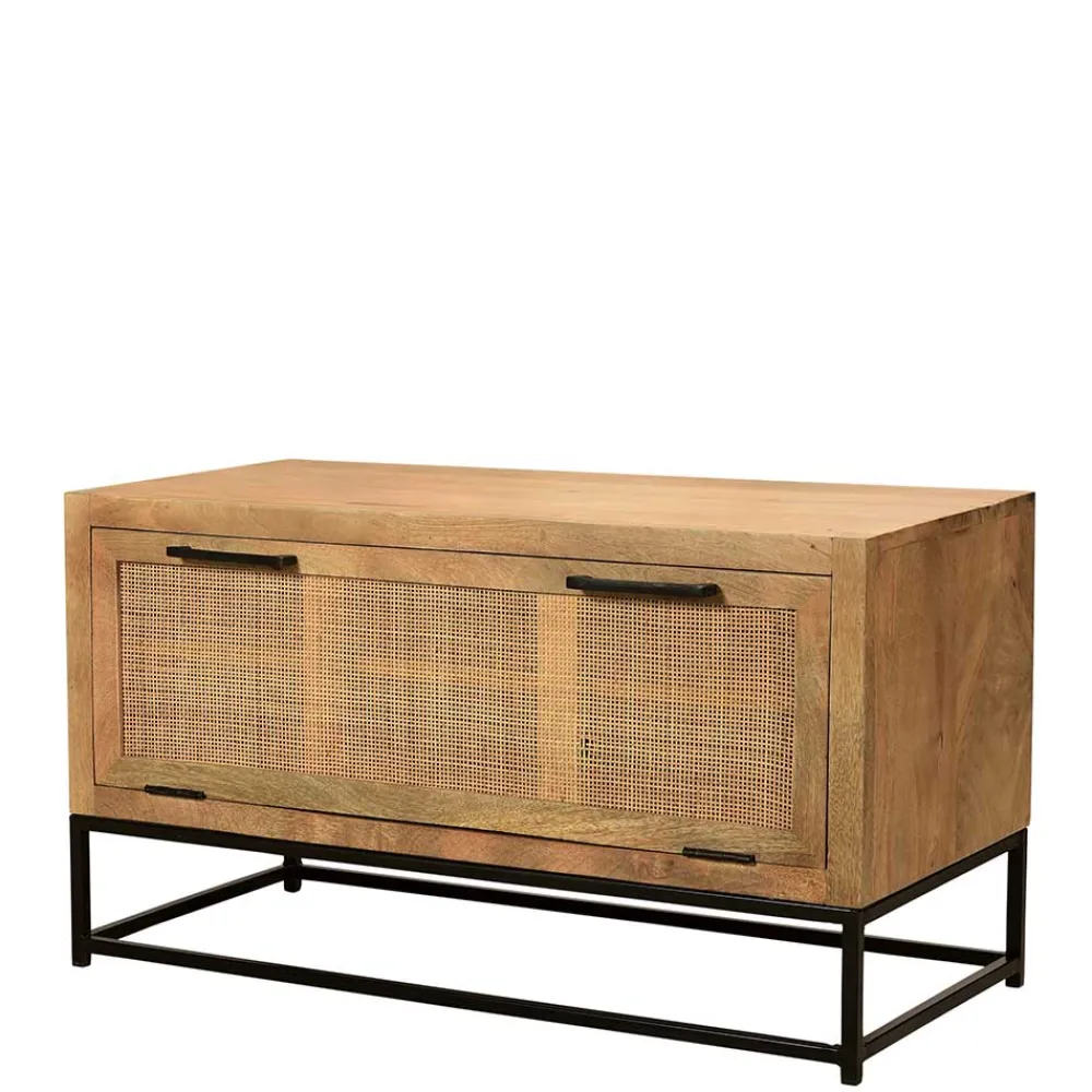 - Hergestellt aus Mangobaumholz, Metall und Rattan