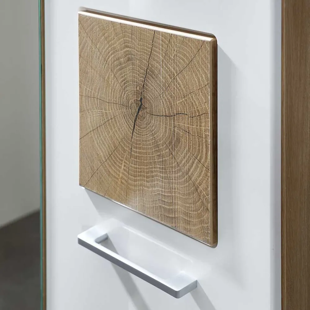 - Fronten weiß hochglänzend mit Rillenfräsung und Hirnholz-Optik Applikationen