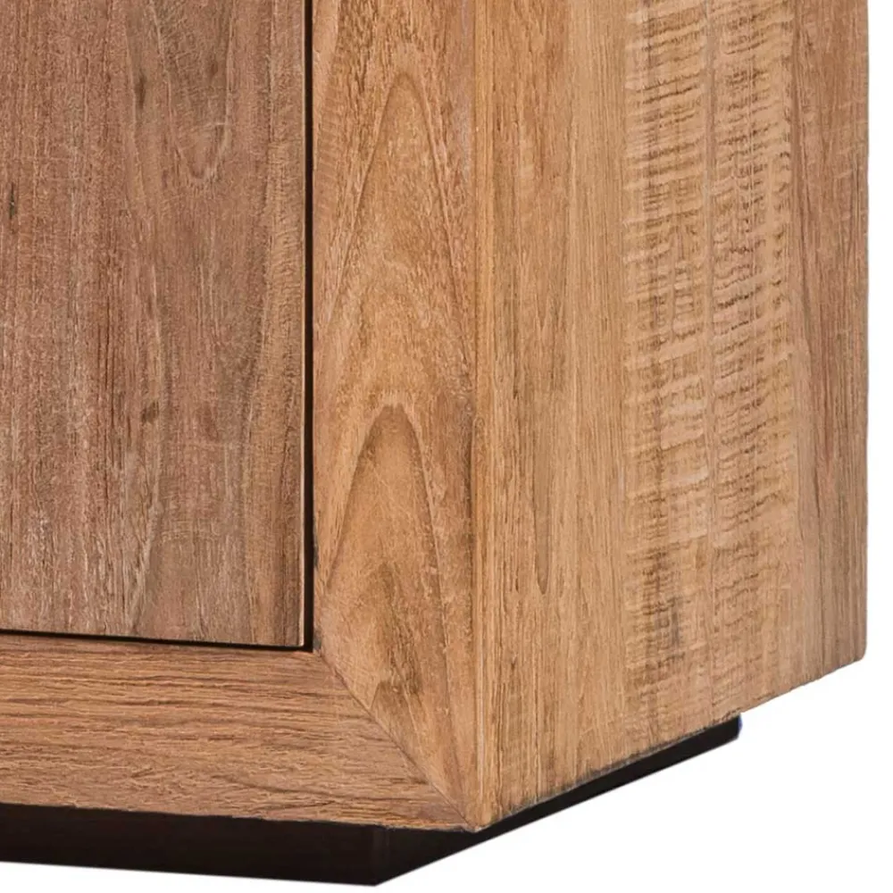 - Aus massivem Teakholz (Front, Sockel) und mehrfach verleimtem Schichtholz (Korpus, Einlegeböden) hergestellt