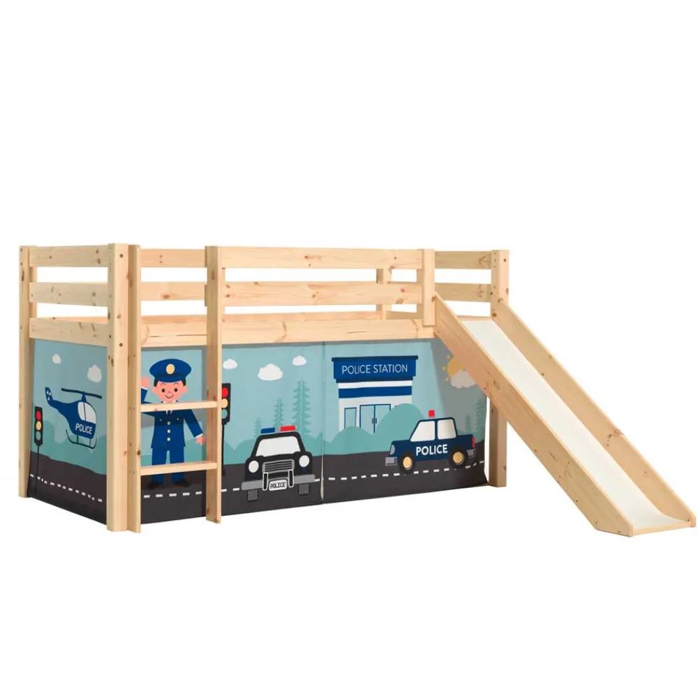 - Kindgerechtes Halbhochbett in Blau- und Brauntönen sowie Kieferfarben
