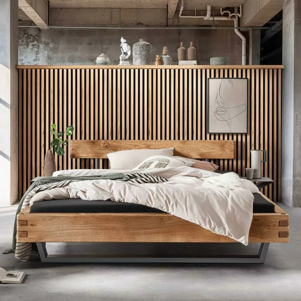 - Robustes Balkenbett in Wildeichefarben und Grau