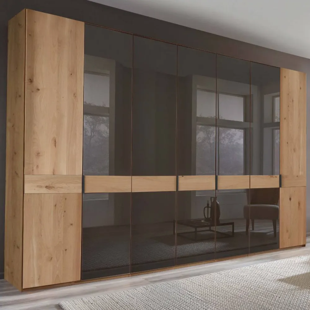 - Sieben Drehtüren mit Soft Close Metallscharnieren, fünf aus Holzwerkstoff mit Glasbeschichtung in Dunkelbraun, Bauchbinden und äußere Türen aus Massivholz