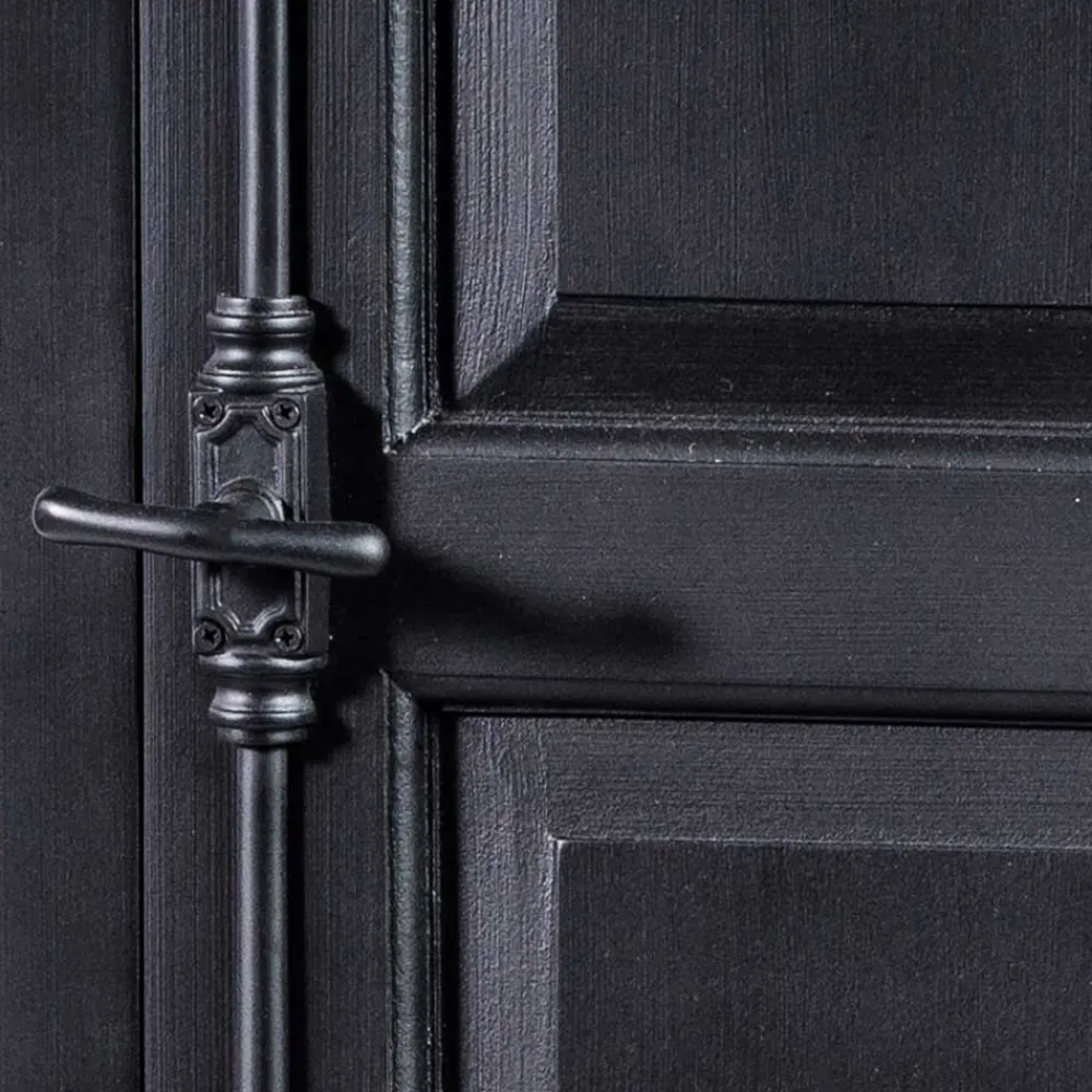- Metall-Klappgriffe an den Schubladen, Schlossstange mit Knebel zum Drehen an der Tür