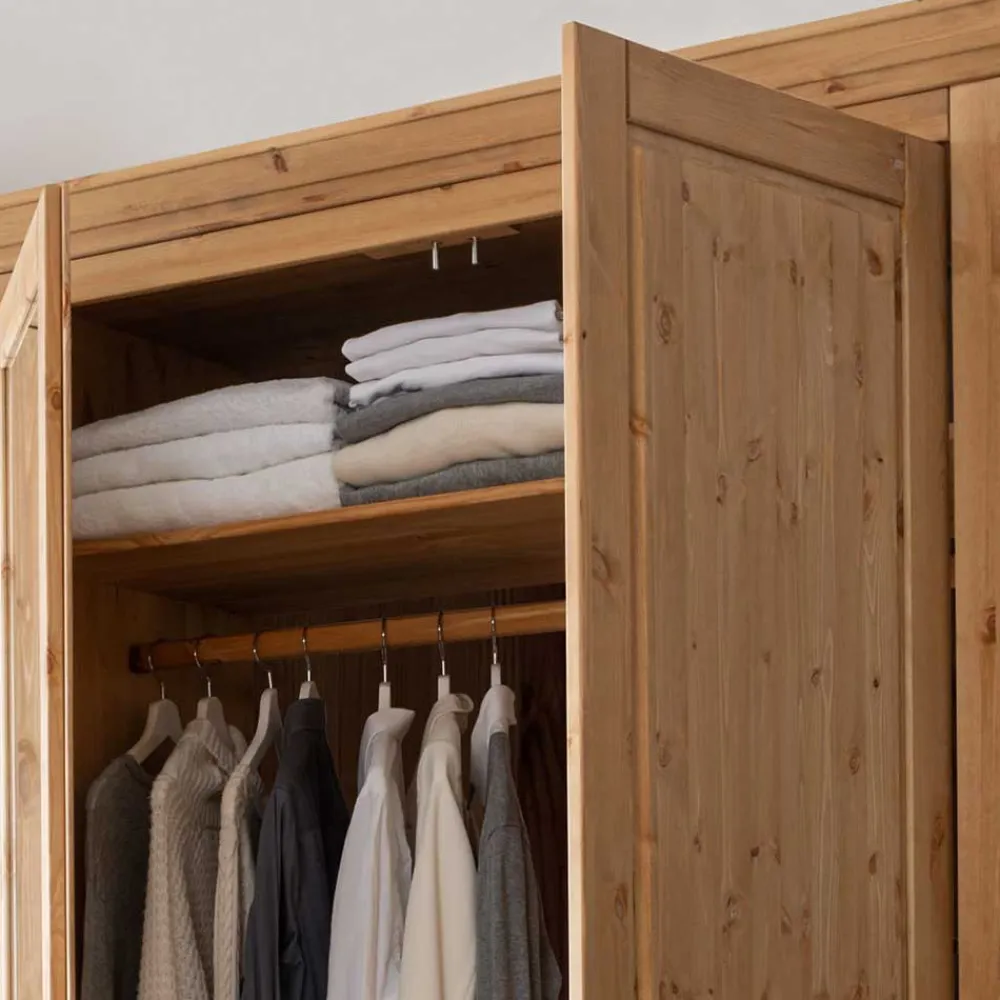 - Zwei abschließbare Doppeltüren, dahinter je eine Kleiderstange und ein Einlegeboden