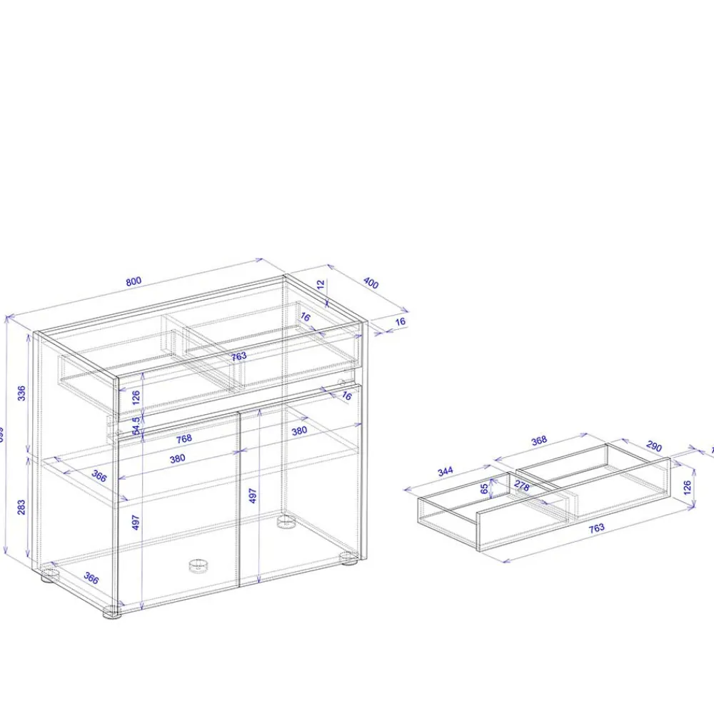 - Eine Schublade mit Metallauszug, innen zweigeteilt, Innenmaße (BxHxT): jeweils ca. 34,4×6,5×27,8 cm