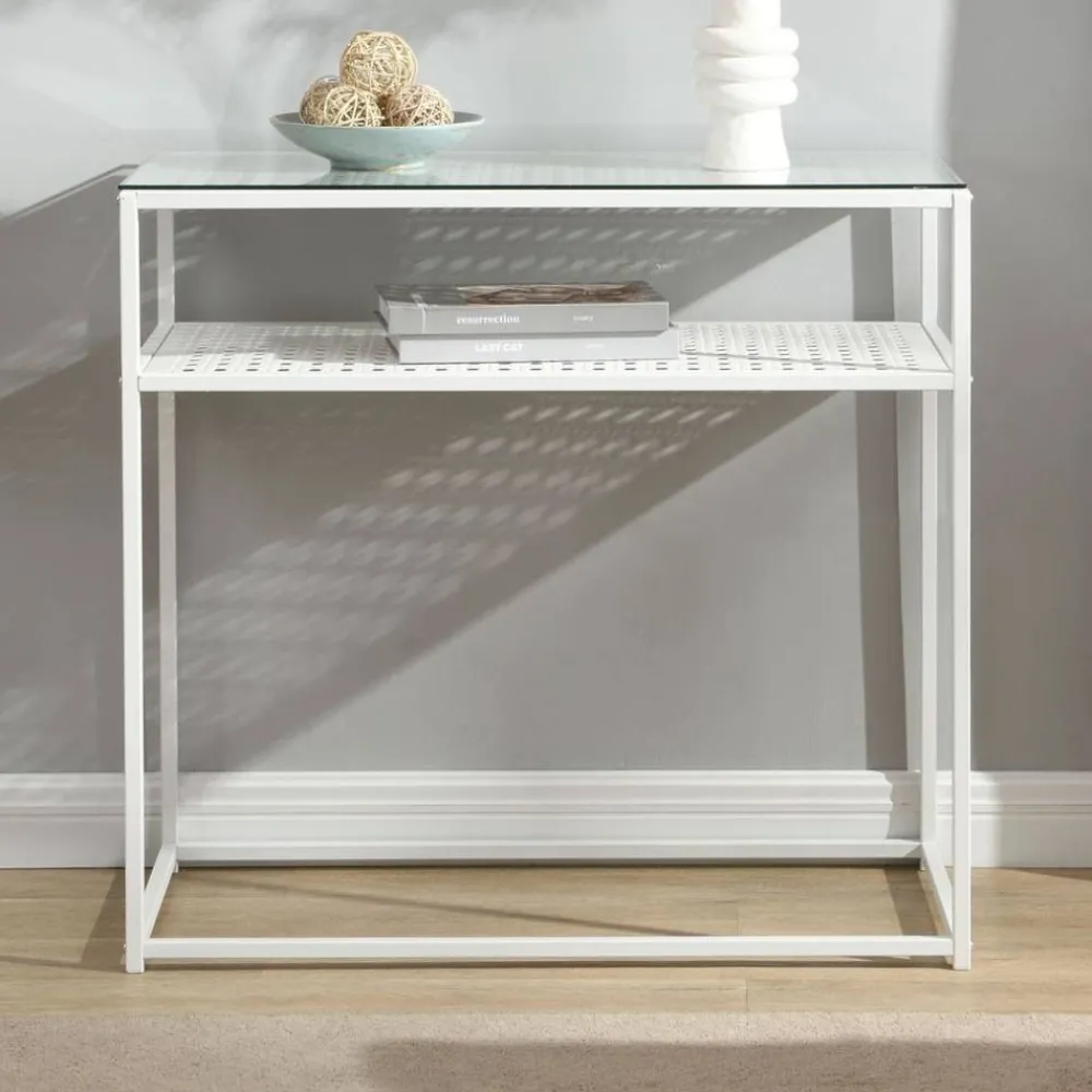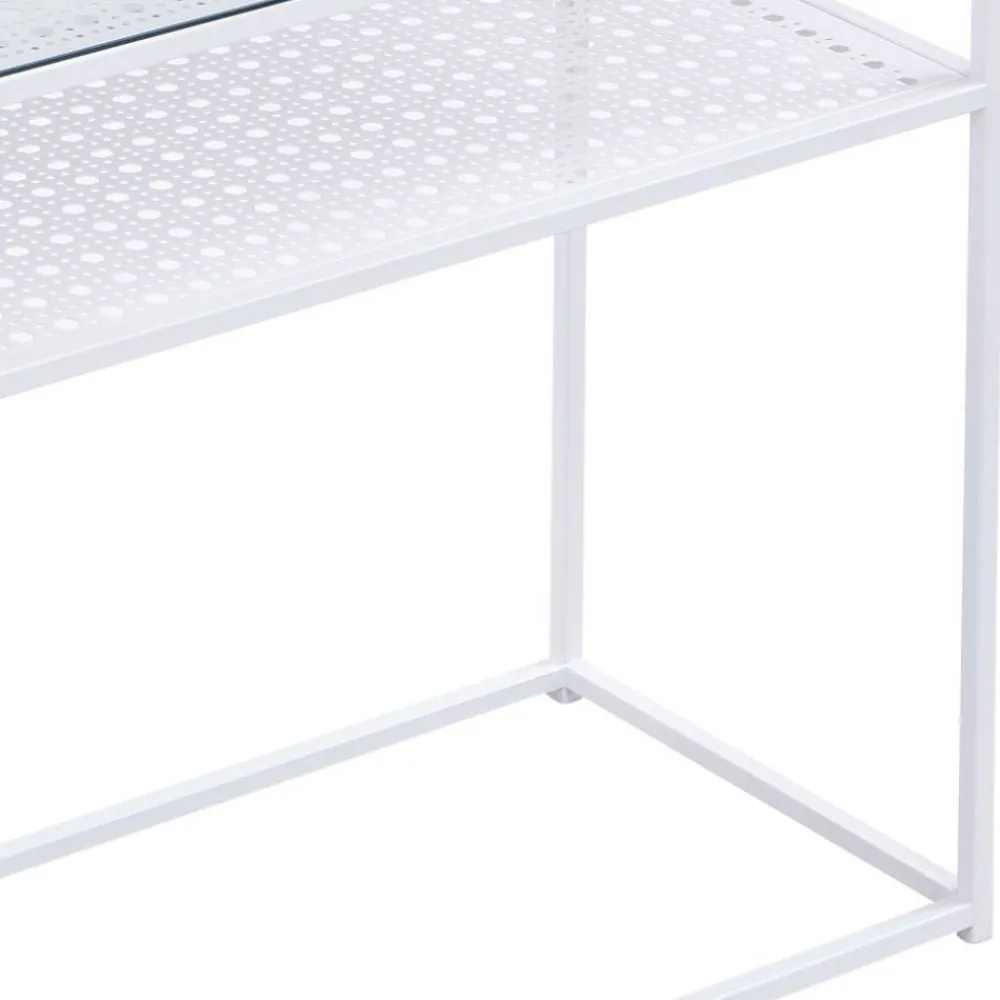 - Tischplatte aus klarem Sicherheitsglas, darunter eine Gitterplatte