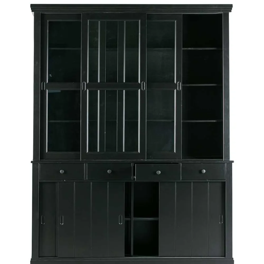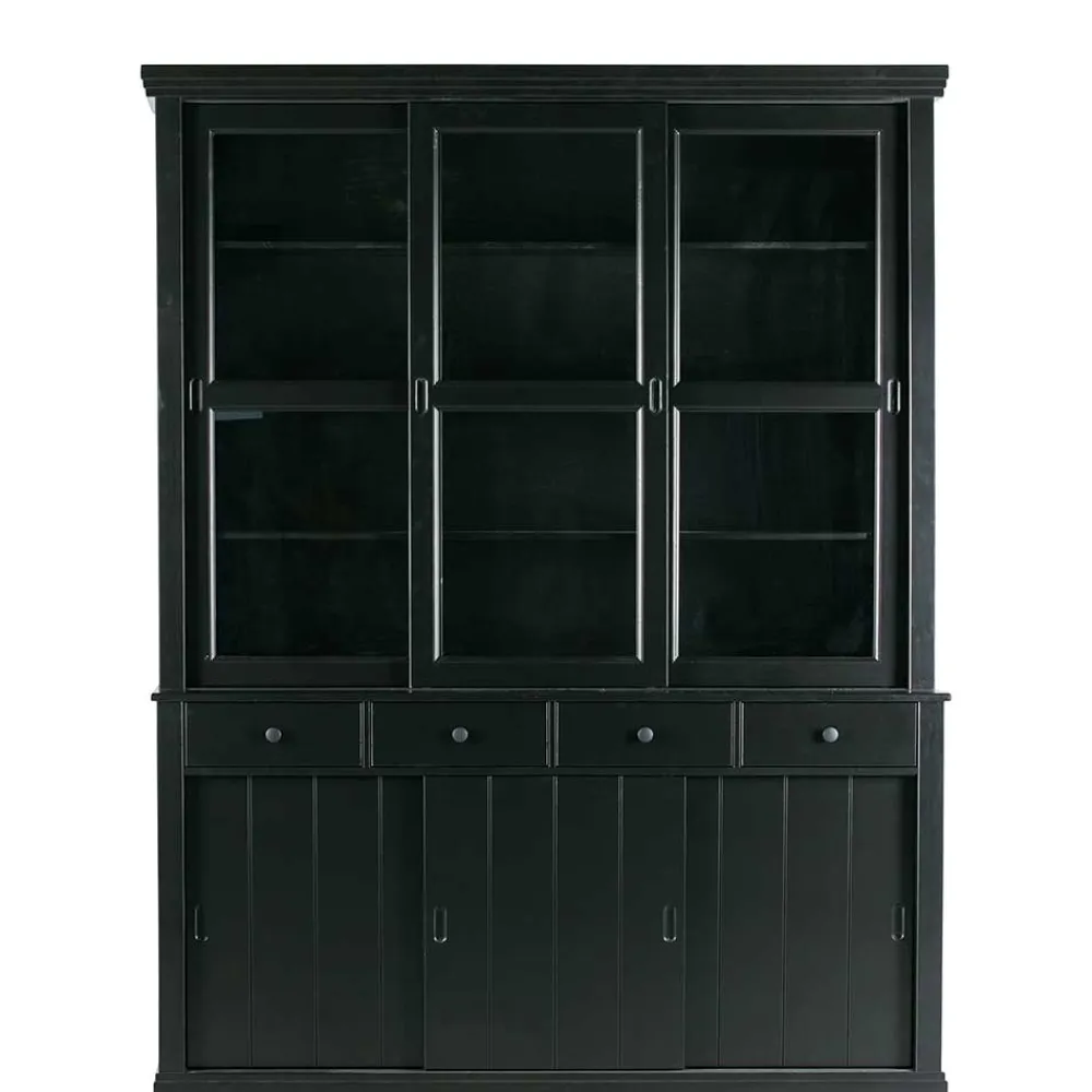 - Oben drei Glas-, unten drei Holzschiebetüren (auf Kunststoffschienen)