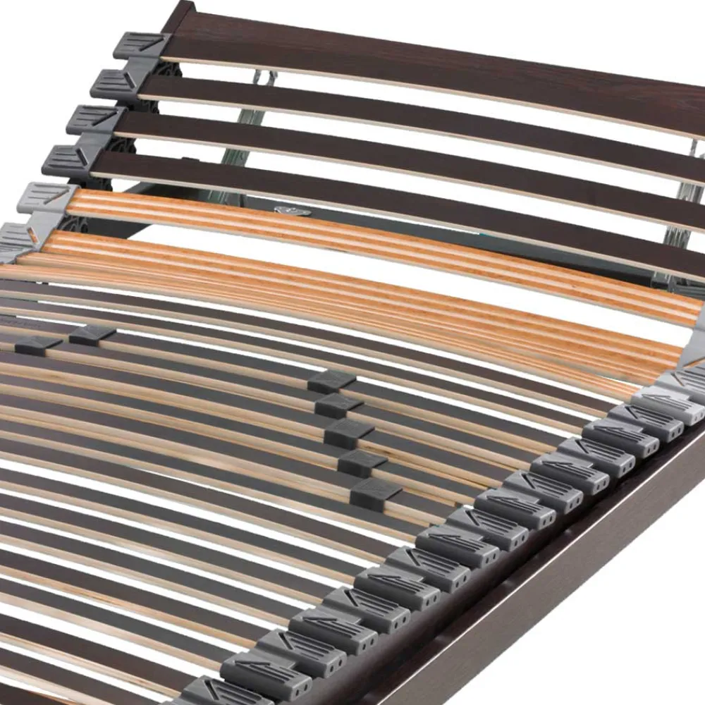 - 26 flexible Federholzleisten bei einer Länge von 190 cm, 30 Leisten bei 210 cm und 32 Leisten bei 220 cm, Zweipunktlagerung mit beweglichen Kautschukkappen