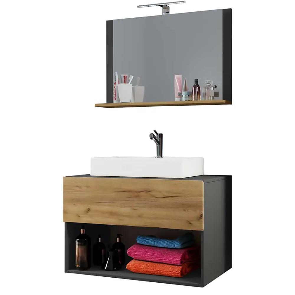 - Dekoratives Badmöbel Set in Anthrazit und Wildeiche Honigfarben