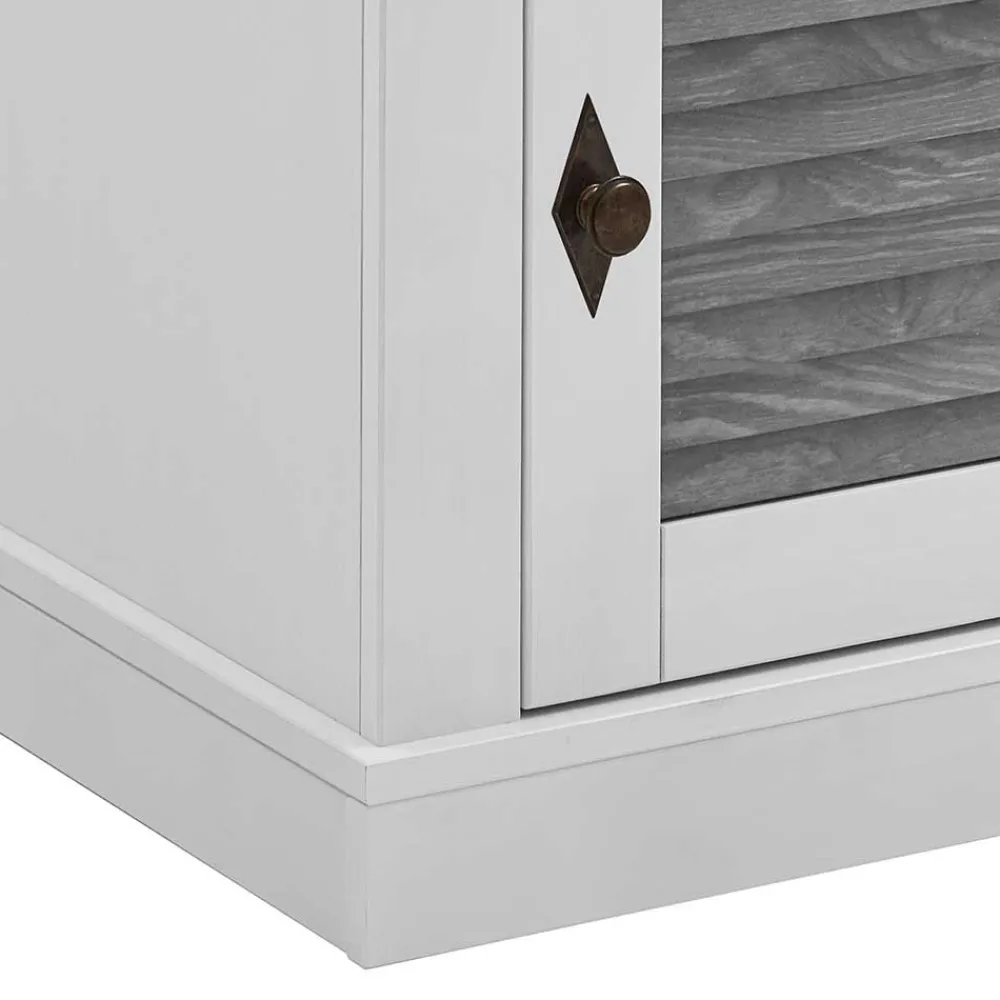 - Unten eine Tür mit grauen Lamellen, innen ein Einlegeboden