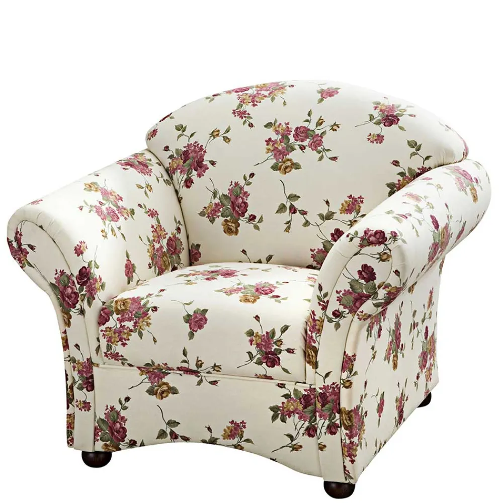 - Verspielter Sessel in Beige, bunt geblümt und Nussbaumfarben