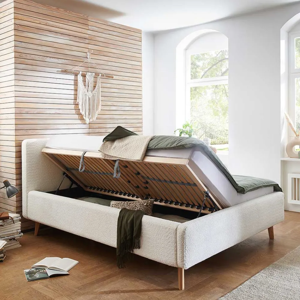 - Ansprechendes Polsterbett in Cremeweiß und Eichefarben