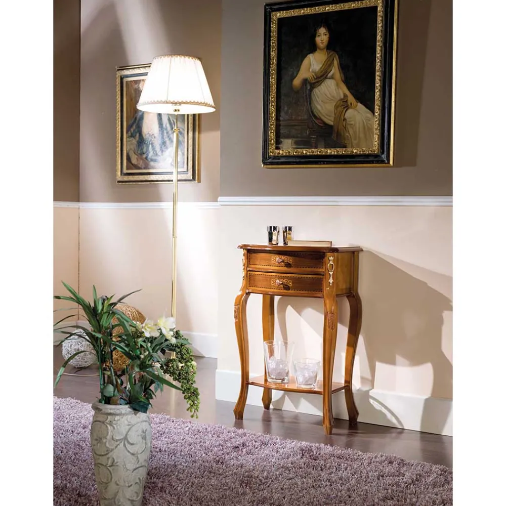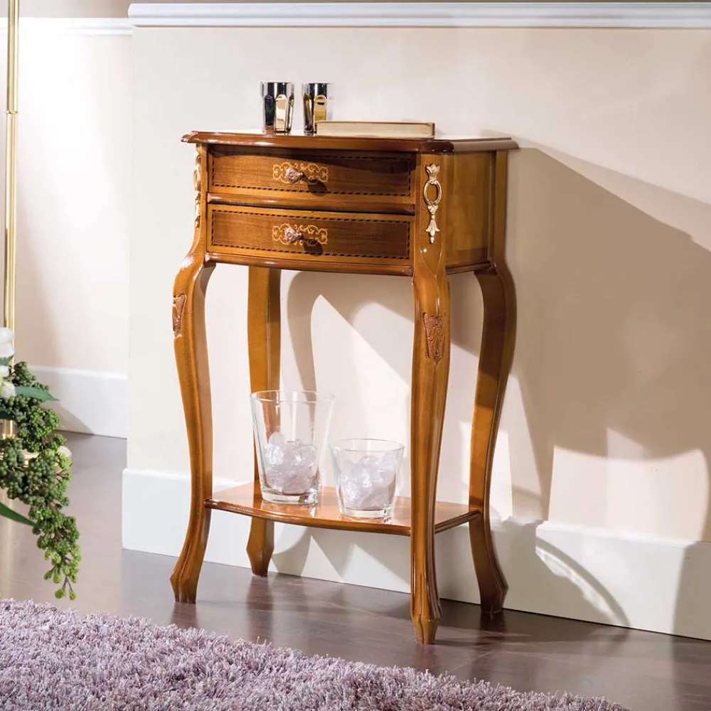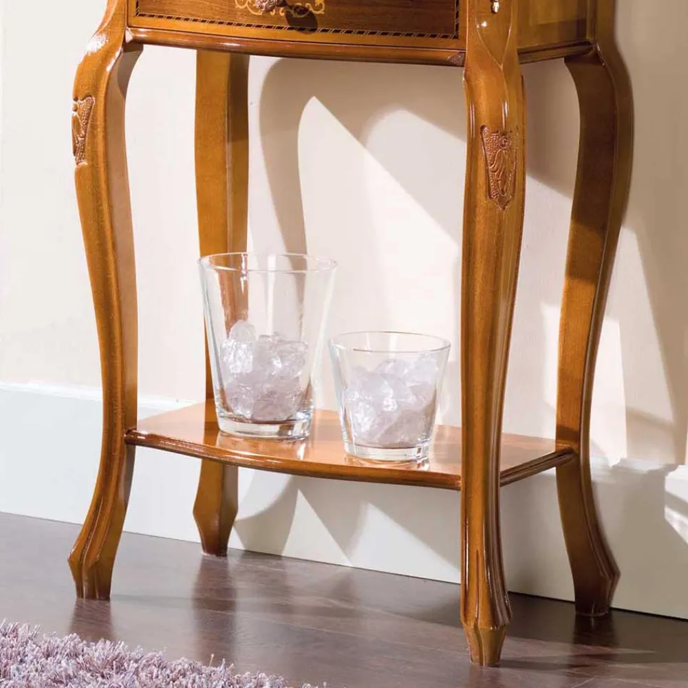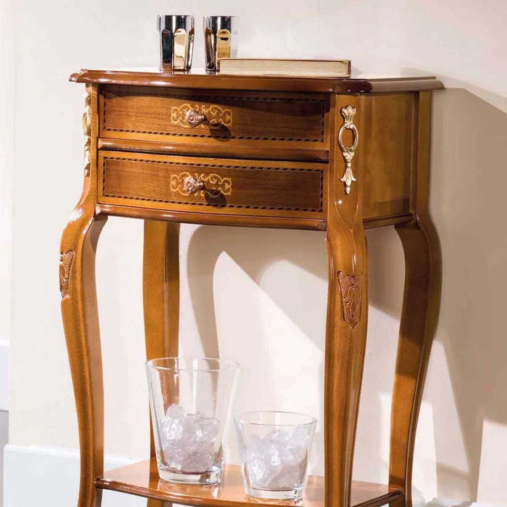 - Oberflächen aus MDF sind in Nussbaumholz furniert, ebenso wie die aus Pappelholz gearbeiteten Schubladen, diese sind zusätzlich mit handgearbeiteten Intarsien versehen