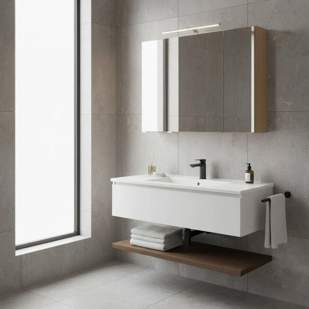 - Klassischer 3D Bad Spiegelschrank in Buche hell