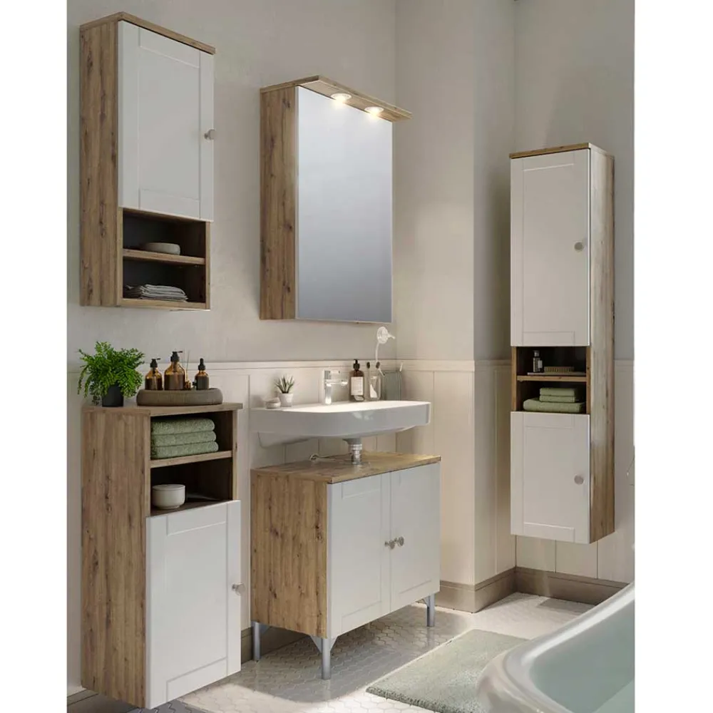 - Attraktiver Bad Hochschrank in Weiß und Wildeichefarben