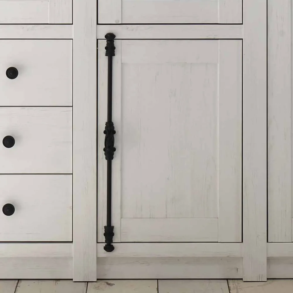 - Klassische Knopfgriffe und rustikaler Stangengriff aus Metall in Schwarz
