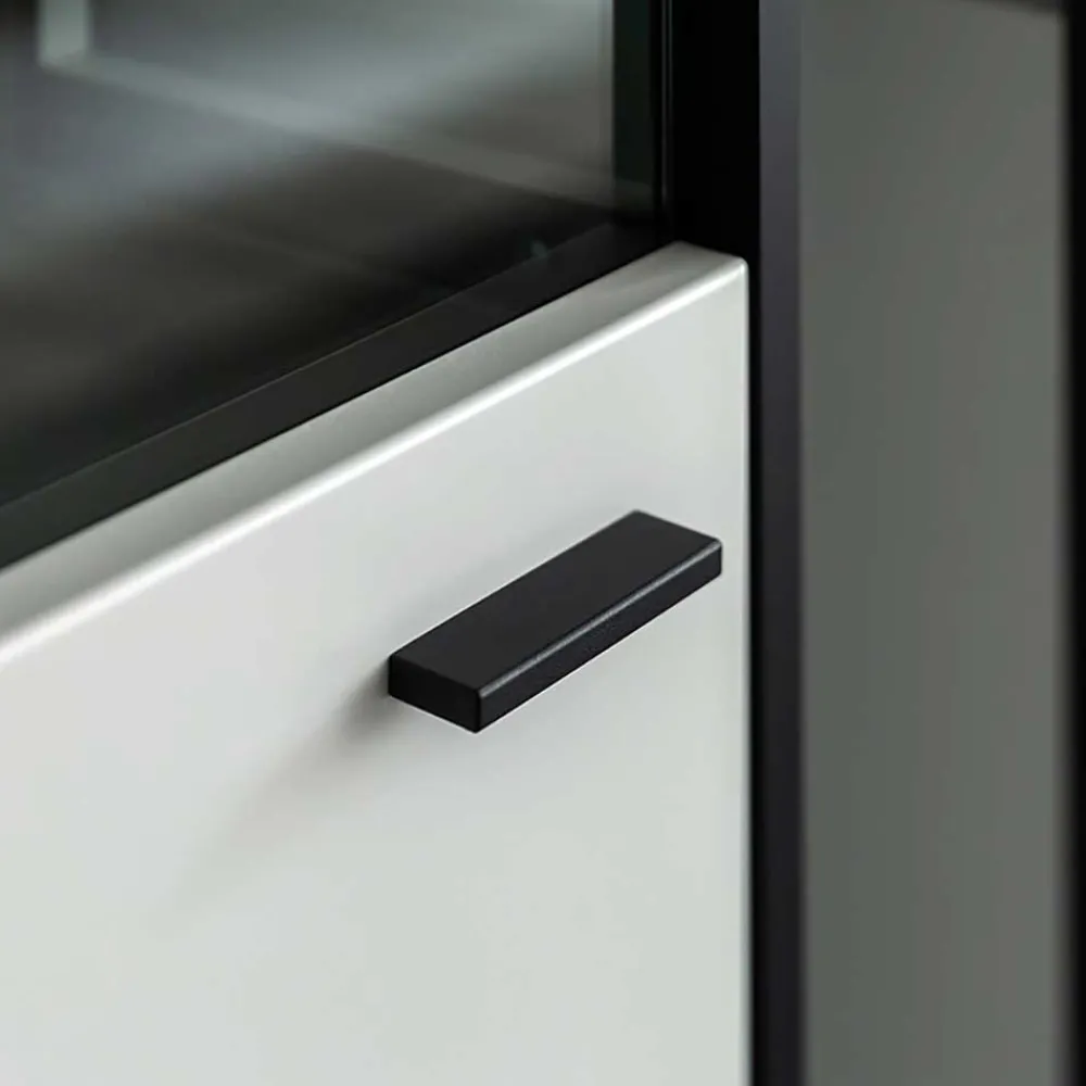 - Korpus Oberflächen melaminbeschichtet, Front tiefgezogen foliert, Front mit Aluminium Profil in Schwarzgrau und Fräsrillen