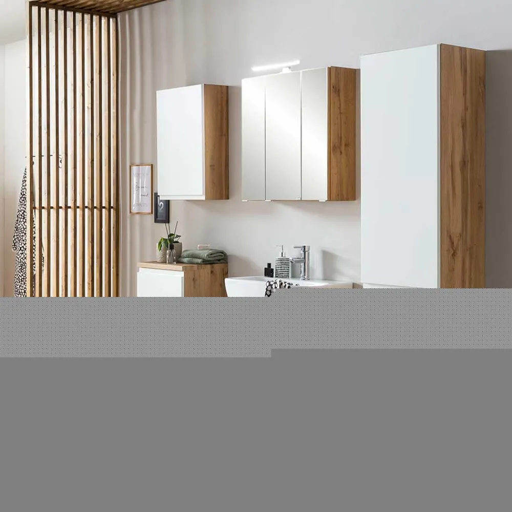 - Schlichter Waschbeckenunterschrank in Weiß und Wildeichefarben