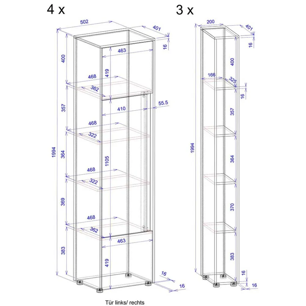 - Fünf Fächer in Ordnerhöhe, Innenmaße (BxHxT): ca. 46,8x40x36,2 cm, 46,8×35,7×32,2 cm, 46,8×36,4×32,2 cm, 46,8×36,9×36,2 cm, 46,8×38,3×36,2 cm