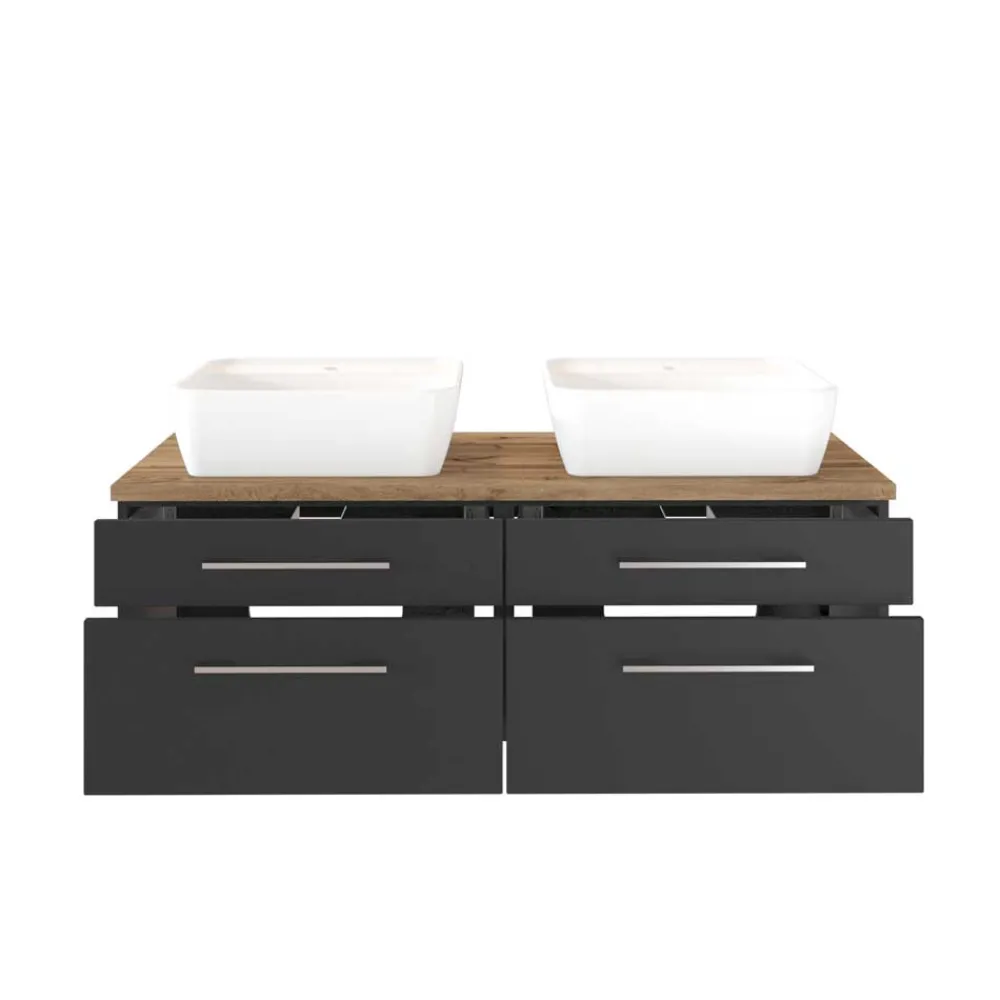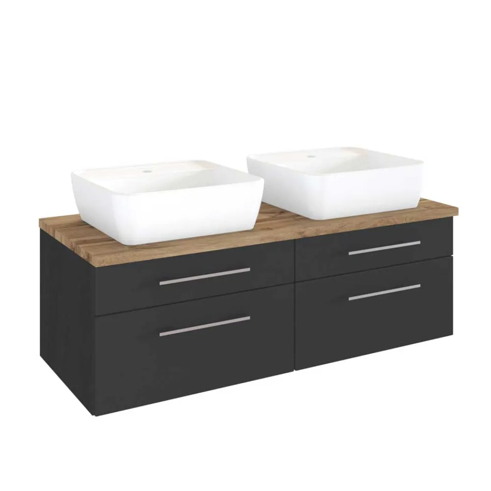 - Korpus in dunkel Grau melaminbeschichtet, Front in dunkel Grau und Deckplatte im Holzdekor Wildeiche foliert