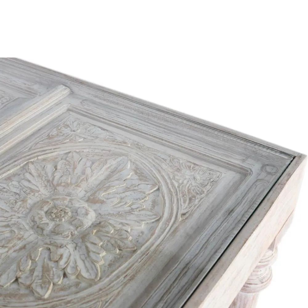 - Aufwändig handbeschnitzte Tischplatte mit 8 mm Glasauflage