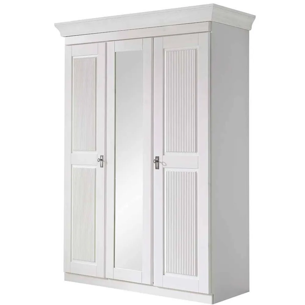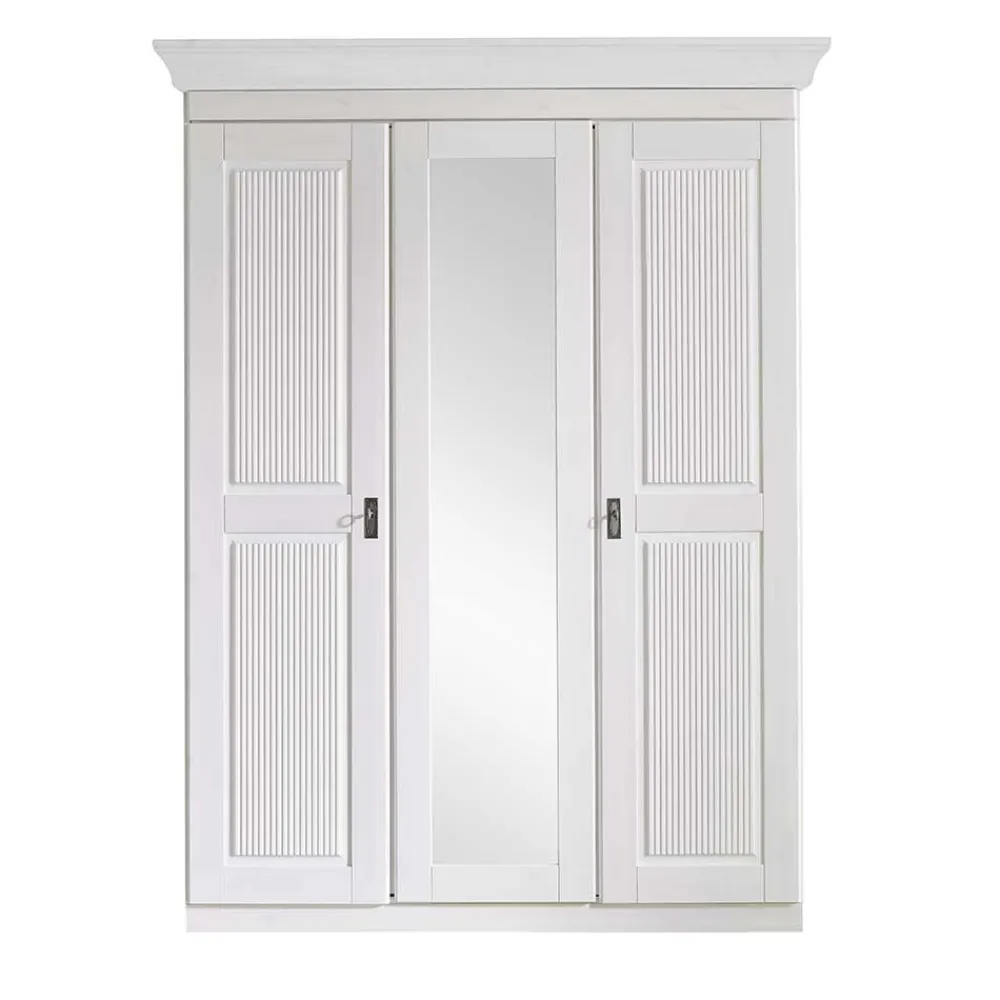 - Aus Kiefer Massivholz (Front, Kranzleiste, Einlegeböden und Sockel), Spiegelglas und MDF (Seiten) gefertigt