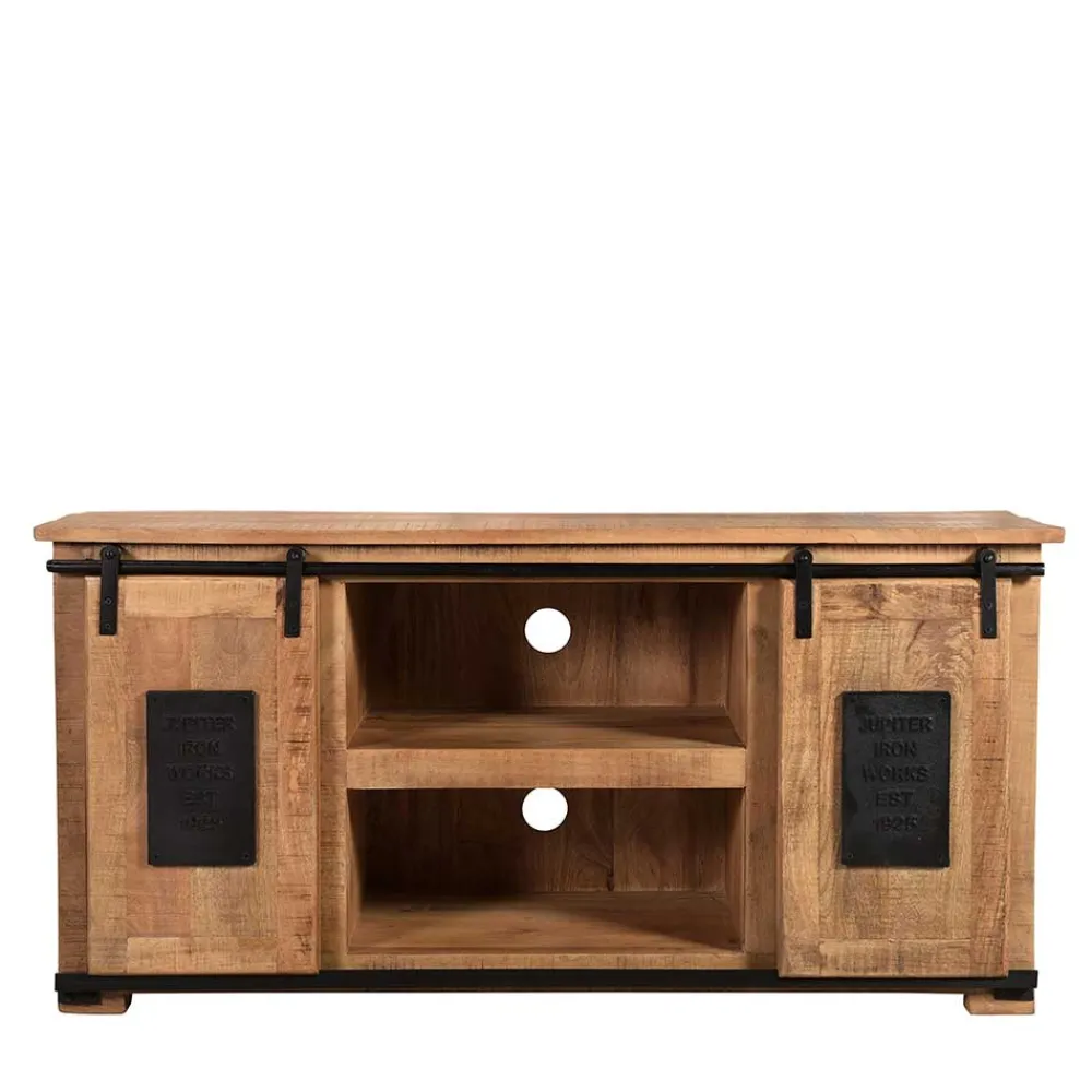 - Kantiges TV-Board in Mangoholz Naturfarben und Antikschwarz