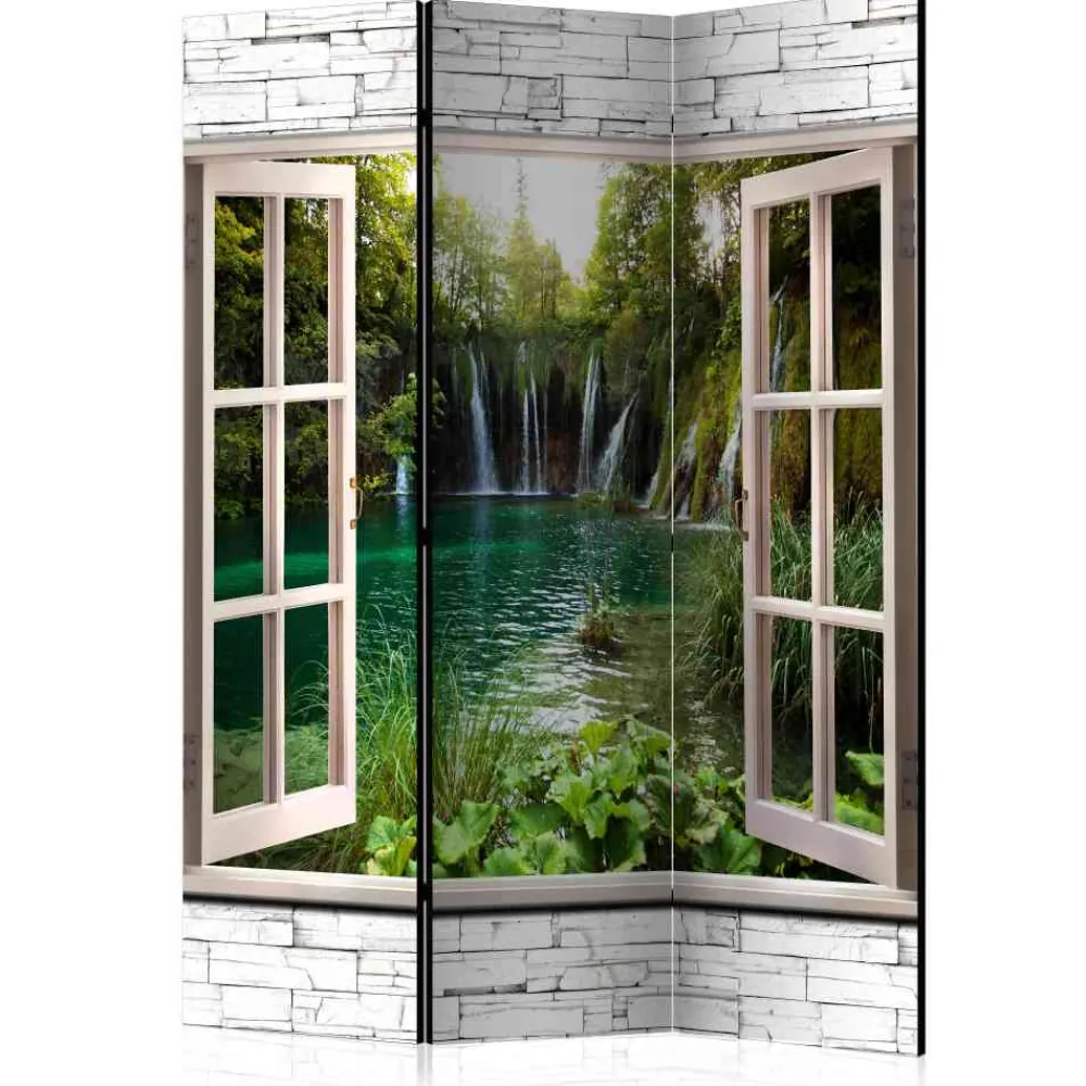 - Romantisches Fenster Motiv mit Blick auf eine Seenlandschaft mit kleinen Wasserfällen in 3D-Optik