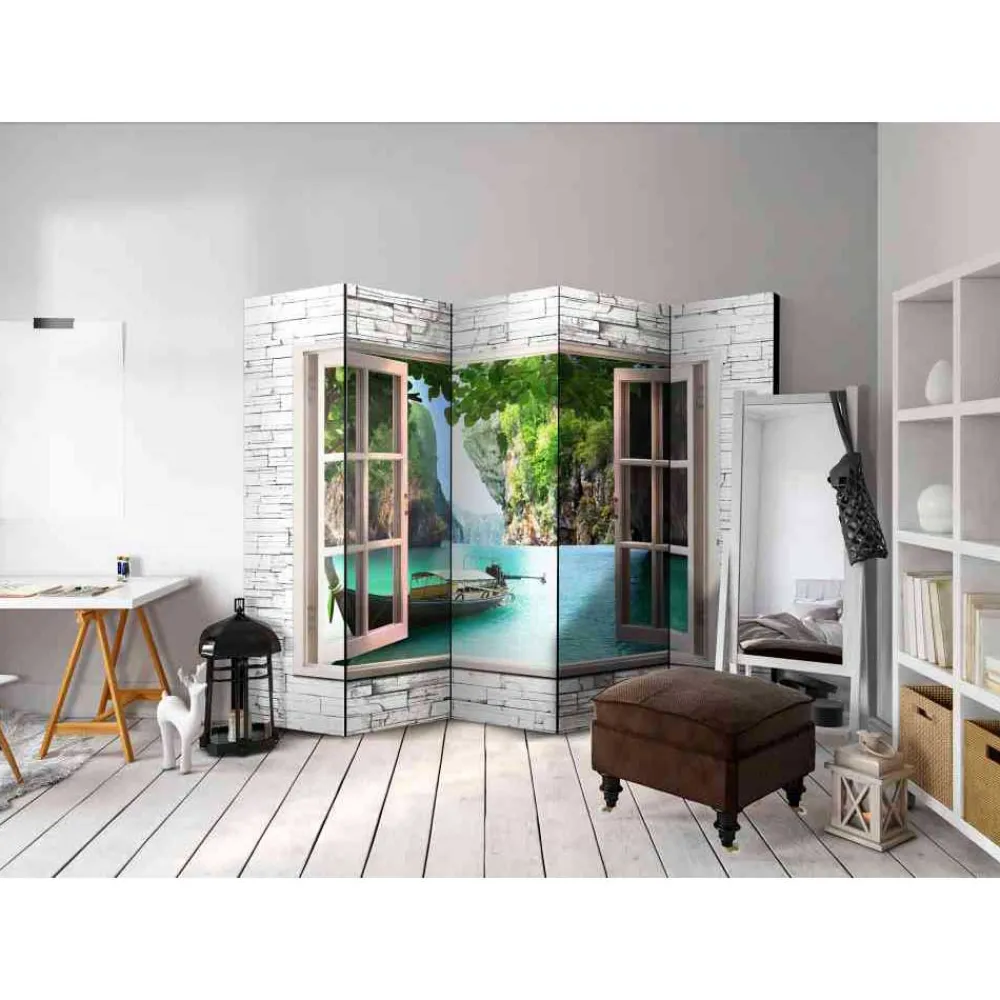 - Traumhaft schönes Motiv mit geöffnetem Fenster, Boot und Seenlandschaft in 3D-Optik