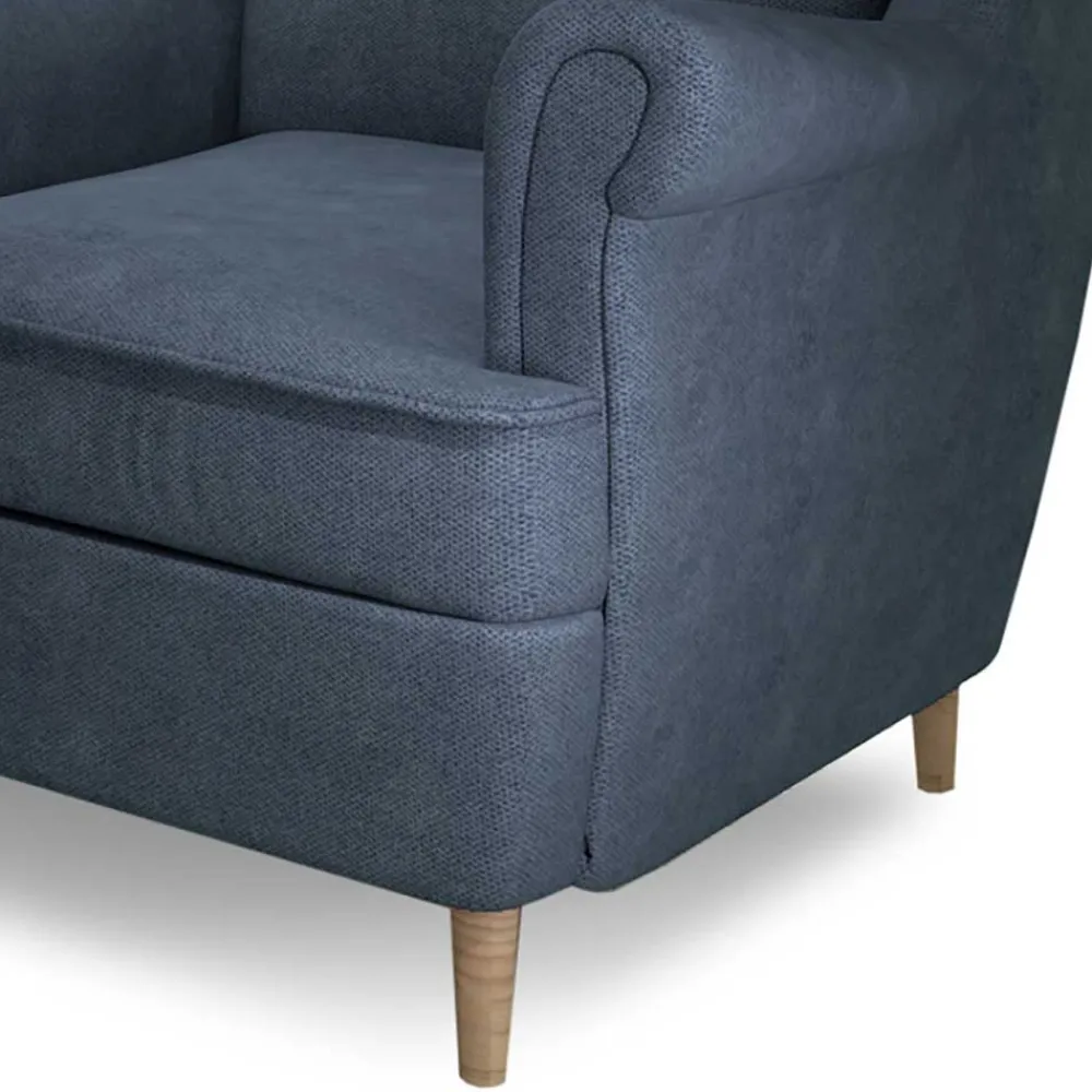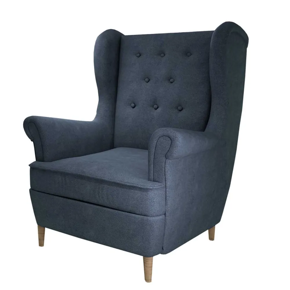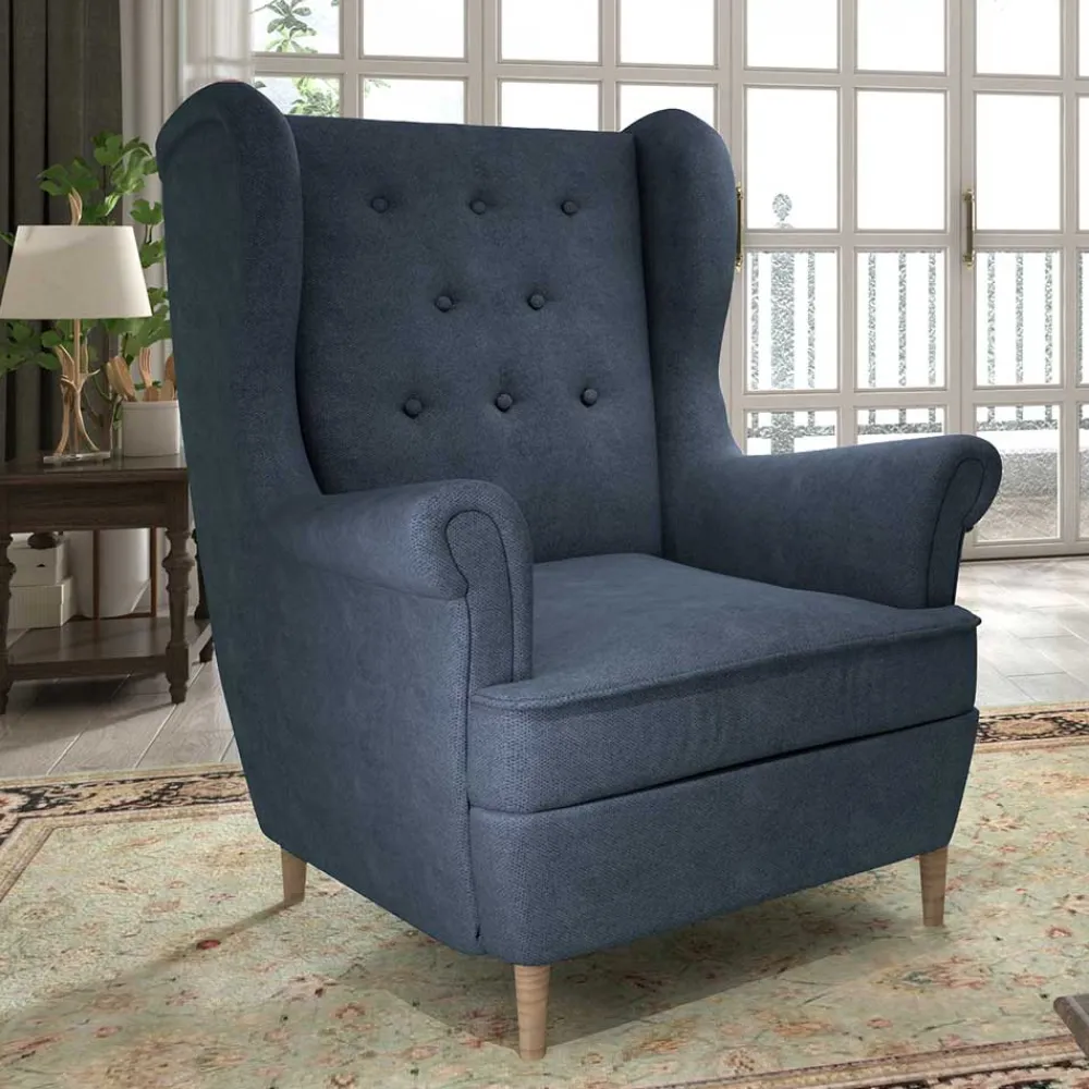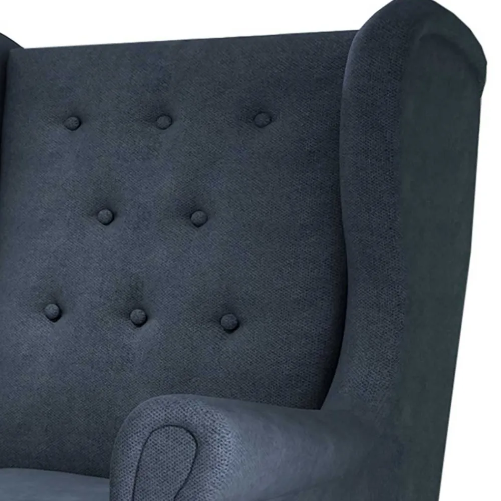 - Hohe, leicht nach hinten geneigte Rückenlehne mit dekorativen Zierknöpfen