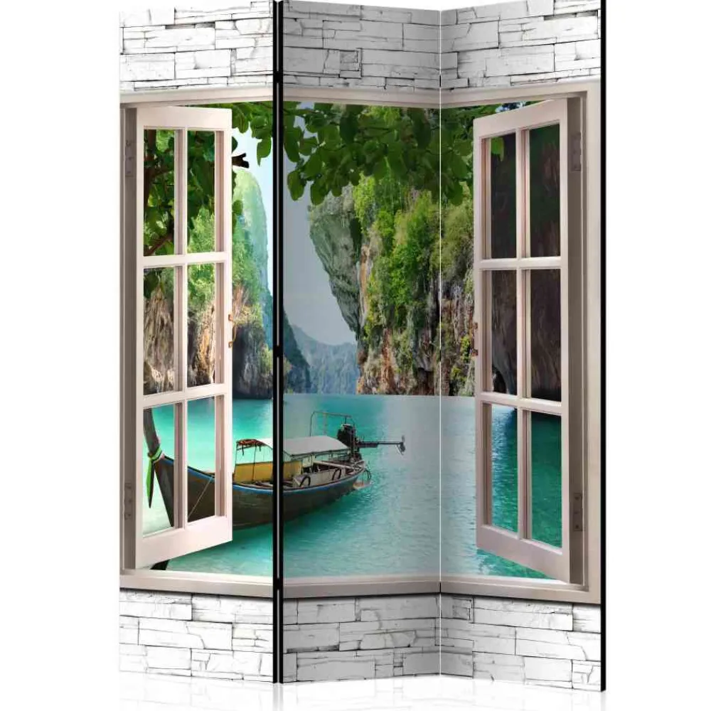 - Traumhaft schönes Motiv mit geöffnetem Fenster und Seenlandschaft in 3D-Optik