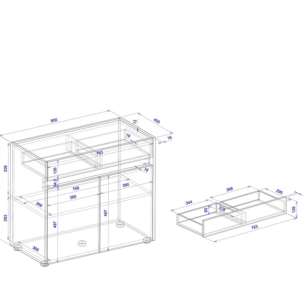 - Eine Schublade mit Metallauszug, innen zweigeteilt, Innenmaße (BxHxT): jeweils ca. 34,4×6,5×27,8 cm