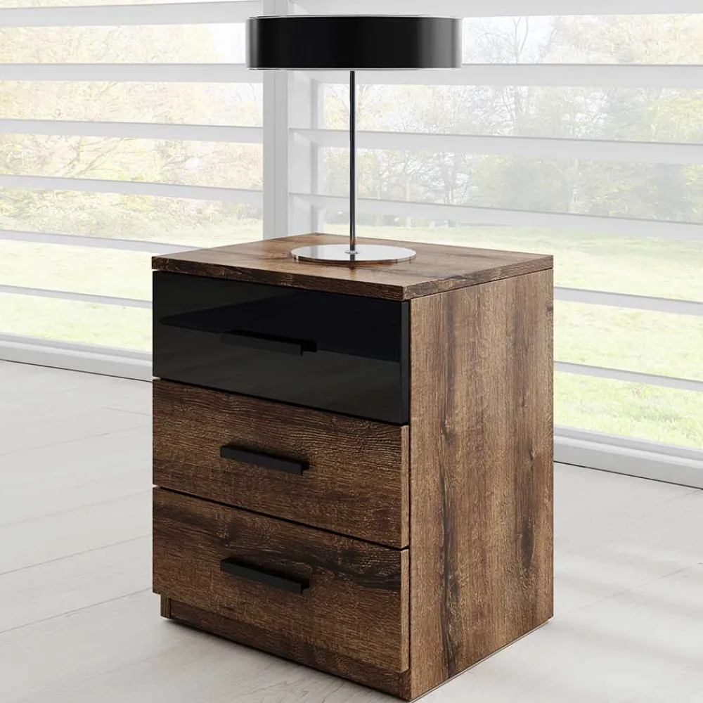 - Kompakte Nachtkommode in Wildeiche dunkel und Schwarz