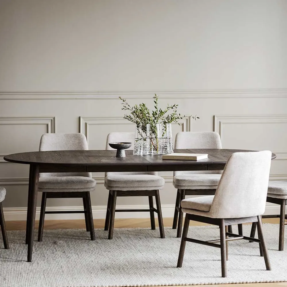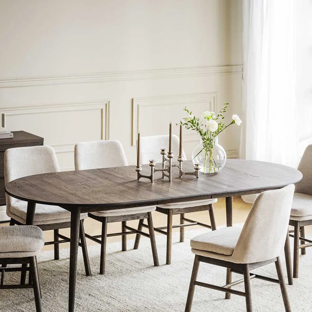 - 001: Breite: 210 / verlängerbar um 40 cm, von 170 auf 210 cm / mit Kulissenauszug mit einer Einlegeplatte / für sechs Personen